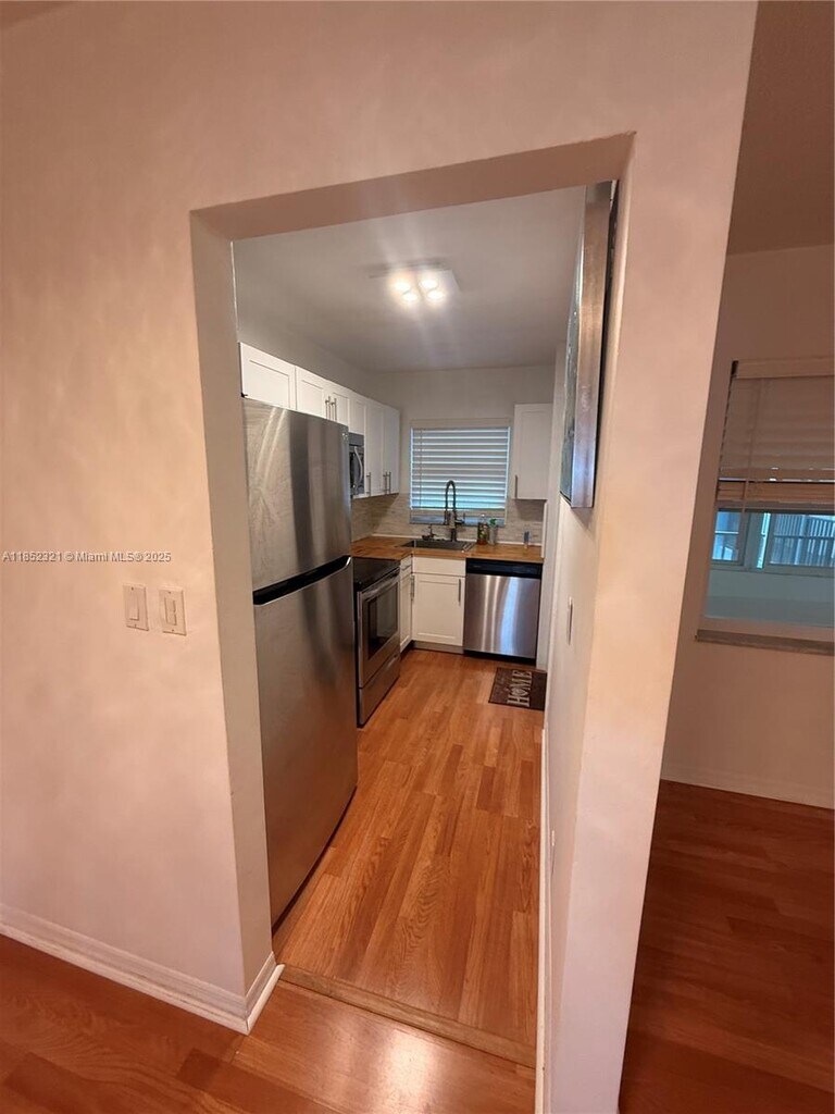 Cozy unit with stainless steel appliances, central A/C, laminate floors, and wood countertops. Includes one assigned parking space. Great location close to shops, dining, and entertainment at Hollywood Circle.