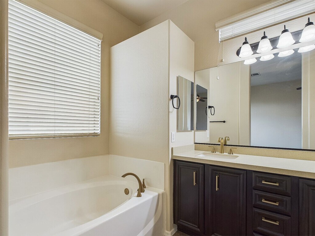 Move-In Special! $350.00 OFF FIRST MONTHS RENT!!! Stunning Remodeled Home in Escalante at Mountain Bridge, Mesa, AZ Welcome to your dream home! This beautifully remodeled 3-bedroom, 3-bathroom single-level home with a den offers 2,150 sq. ft. of modern elegance in the highly sought-after gated community of Escalante at Mountain Bridge. Home Features: Newly remodeled bathrooms with updated fixtures. Newly installed vinyl plank flooring throughout. Newly painted interior and exterior for a fresh, modern look. New Water Softener. Spacious kitchen with brand-new appliances, granite countertops, a large island, and upgraded staggered dark maple cabinets. Extra-large retractable sliding glass door in the great room, featuring a remote-controlled interior sunshade for comfort and style. Ceiling fans and window coverings for added convenience. Covered patio perfect for entertaining guests. Community Amenities: Mountain Bridge offers resort-style living with: Clubhouse with multi-purpose room and extensive outdoor patio. Swimming pool and spa. Fitness center. Racket sports and basketball courts. Putting green and soccer field. Children's playground. Lease Details: Monthly Rent: $2,995.00 Refundable Security Deposit: $2,995.00 Non-Refundable Admin Fee: $150.00 Application Information: Applications available online at Important Notes: Clients are responsible for verifying school information and measurements. Don’t miss this incredible opportunity to live in a beautifully remodeled home in a fantastic community. Schedule a showing today!