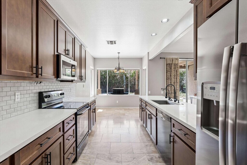 Beautiful 4-bedroom,2-bath rental with a private pool in a desirable neighborhood. This well-maintained home features a bright,open layout with neutral finishes and plenty of natural light throughout. The kitchen offers quartz countertops,stainless steel appliances,ample cabinet space,and opens to the main living areasperfect for everyday living and entertaining. Spacious primary suite includes dual sinks,a walk-in shower,and soaking tub. Additional bedrooms provide flexibility for guests,home office,or extra living space. Enjoy Arizona living in the backyard with a sparkling pool,covered patio,and low-maintenance desert landscaping. Conveniently located near shopping,dining,and freeway access. MLS ID 7017648