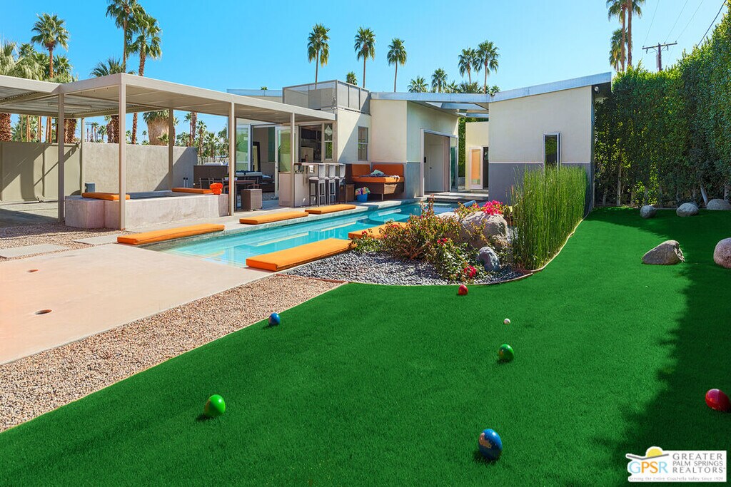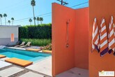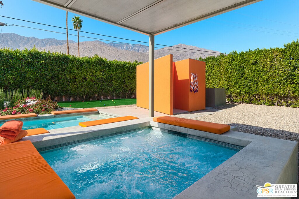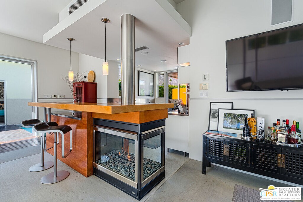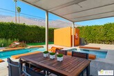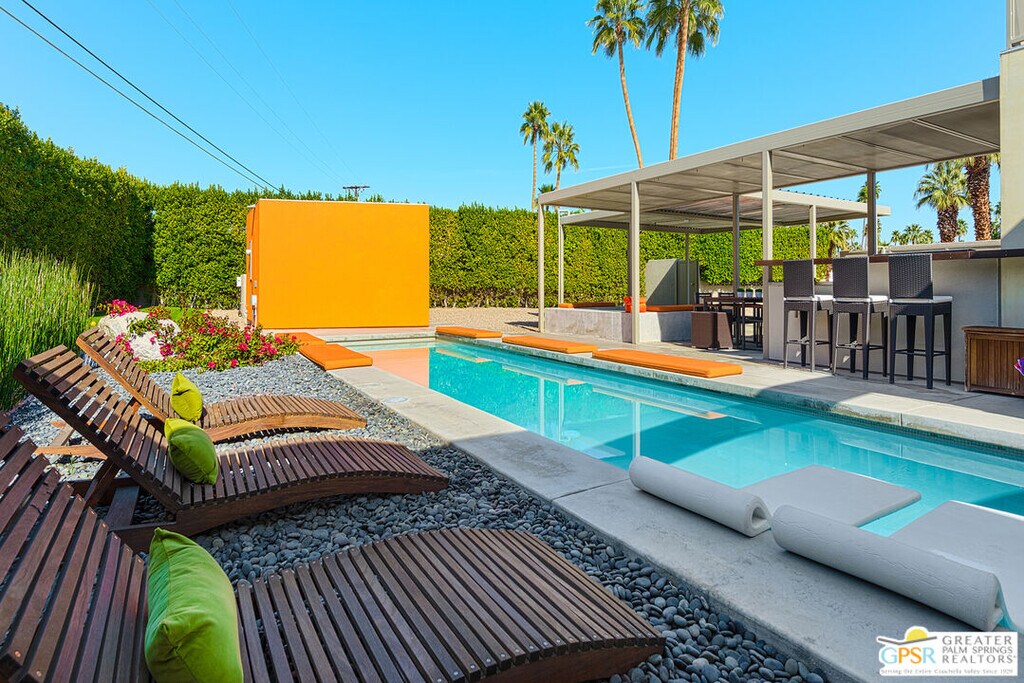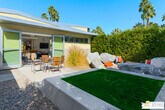 Available only Nov+Dec 2025. Seasonal Rental. This unique Palm Springs modem compound is in the popular Twin Palms Estates neighborhood. The walled and gated property features multiple structures and outdoor spaces, resort-style amenities, and architectural design reminiscent of the iconic Alexander butterfly mid-century modern homes. This Palm Springs home truly speaks to the Art of Desert Living, has been cited and featured in a variety of magazines worldwide and won Home of The Year in Metropolitan Home. The art of desert living is best exemplified in a property's outdoor amenities, and this property doesn't disappoint. Amenities include a 60 ft saltwater pool, large saltwater spa, outdoor kitchen, outdoor bed, 4 fire-pits, 2 outdoor showers and more. There is about 2,000 sqft of interior space spread out over 3 buildings. The main house consists of a living room, dining room and kitchen. All rooms have concrete floors and large sliding glass doors, that when opened, blur the line between indoor and outdoor spaces. The living room features a wall mounted TV plus a large seating area with L-shaped sofa, ottoman and 2 comfortable chairs. A large sliding glass door connects the living room to an outdoor bed with pool and mountain view. Next to the Dining room is the kitchen. The two rooms are separated by a breakfast bar with a built-in fireplace. The kitchen itself has a modem and commercial vibe and features high quality appliances including large stove top with grill, oven, wine refrigerator, refrigerator freezer and dishwasher. The adjacent dining room seats six and has two over-sized sliding glass doors. One of the doors opens to a wood bridge that spans the pool to secondary ensuite bedroom and the other door opens to an outdoor dining room, distinctive firepit seating area and a detached structure solely for the primary bedroom and bathroom. The Primary Bedroom is a stand-alone structure just steps away from the main house. Like the main house it has concrete floors and a large sliding glass door, that when opened, blur the line between your bedroom and the outside. Inside you'll find a King size bed, spacious closet, Smart TV and gas fireplace that separate the bedroom from the master bathroom. On the bathroom side, the fireplace is perfectly situated next to the large bathtub. Who needs candles when you can soak beside the flames of a roaring fireplace? There is also a large shower with waterfall shower head, two large sinks, a clerestory window and a door that opens to a private outdoor shower. The Guest bedroom/den structure features a guest bedroom with queen size bed and Smart TV. A bathroom connects it to the guest living room that features a couch that can sleep one, and another Smart TV. The main purpose of this Palm Springs modern compound is rest, rejuvenation, and fun". Flanking the 60 ft saltwater pool, lounge chairs and large outdoor bed float above the water while the outdoor kitchen with gas grill, refrigerator and bar seating area anchor to the additional yard amenities. Next to the outdoor kitchen is a bubbling saltwater spa which is just steps away from an additional outdoor bed perfect for lounging. At the other end of the pool is the Pool House that provides an outdoor shower, cabana room and washer/dryer. On the other side of the compound is a distinctive seating area where guests can sit or lie on huge boulders encircling a recessed fire pit that shoots flames right out of the ground. This desert modern home is distinctive and award-winning; providing an elemental experience that includes earth, fire and water with a generous serving of Palm Springs architecture, upscale amenities and conveniences, and a chic urban vibe." MLS# 25576165PS
