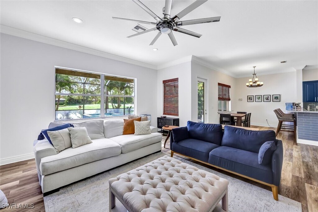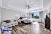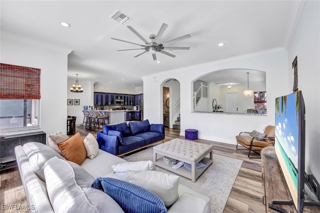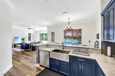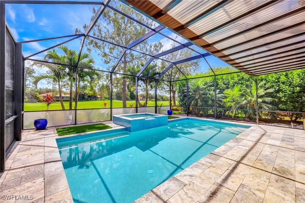Experience unparalleled elegance and tranquility in this exquisite two-story estate,perfectly situated overlooking the serene 2nd hole of a prestigious golf course. This meticulously maintained residence boasts over 3,000 square feet of refined living space,seamlessly blending indoor sophistication with resort-style outdoor living. Step into your private backyard sanctuary,where a stunning custom pool and six-person spa—added in 2017—create a captivating centerpiece surrounded by lush,tropical landscaping. The expansive screened lanai,enhanced with an extended covered area and recently updated with mostly new screens,invites year-round relaxation and entertaining. Travertine tile extends gracefully throughout the lanai and along both sides of the home,where sidewalks lead back to the pool area,creating easy access and elegant flow. This walkway guides you to a stately front entrance,completing the home’s welcoming curb appeal. Inside,the grand master suite is a haven of luxury,featuring dual walk-in closets and a spa-inspired split bathroom layout adorned with bespoke cabinetry,quartz countertops,dual vanities,separate shower,and a freestanding soaking tub—promising ultimate indulgence. The versatile second-floor loft offers abundant space for a home office,game room,or private fitness studio. Throughout the home,premium luxury vinyl plank flooring and designer tile bathrooms complement elegant crown molding,evoking a sophisticated Florida coastal ambiance. The chef’s kitchen is outfitted with a charming farmhouse sink and modern appliances,perfectly blending style and functionality. Recent high-end upgrades include a new pool heater (2025),state-of-the-art pool pump and control board,and a whisper-quiet,contemporary garage door that enhances curb appeal. Nestled within a gated community renowned for its outstanding amenities—including a clubhouse,fitness center,theater,billiards room,and community pool—this residence offers a lifestyle defined by comfort,exclusivity,and convenience. With premier schools just a short walk or bike ride away,this home is perfectly suited for discerning families seeking timeless elegance and an exceptional Florida living experience.