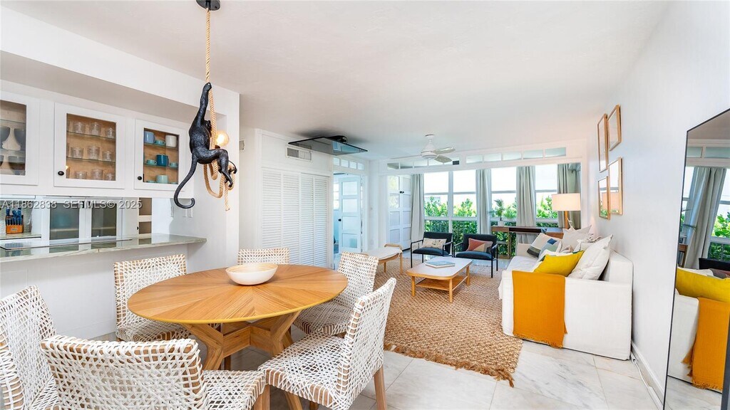 Stylish and inviting corner lanai in a quiet 10-unit boutique building, perfectly located in the heart of Key Biscayne. This fully furnished residence combines contemporary finishes with a warm, homey feel, featuring white marble floors, Brazilian quartz countertops, and custom cabinetry. Large windows flood the space with natural light, while the den with a queen Murphy bed offers the flexibility of a second bedroom. Street-level entry gives it the comfort and privacy of a home. Enjoy FOB beach access just a 5-minute walk away, plus a pool, assigned parking, and free laundry. Smart lock with camera for fingerprint, code, key fob, or app entry. Pet friendly. Available for short-term stays of 3 months or more.