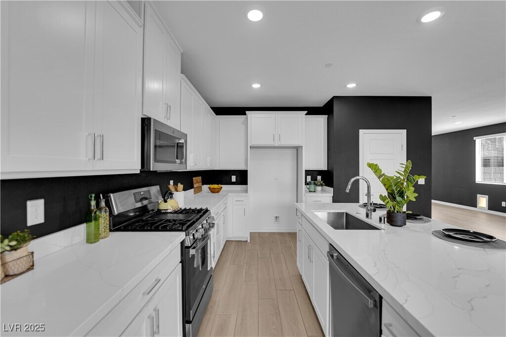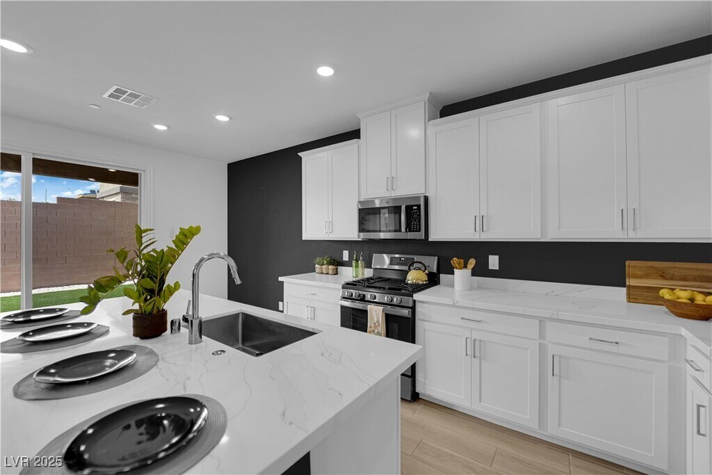 Casita downstairs, a spacious loft upstairs, huge laundry pantry and walk in closets with every room. With over 3000 square feet in a gated community and move-in ready, this home is waiting for your imagination! Kitchen island over 26 ft.² with large stainless steel basin. Modern fixtures, attached to beautiful quartz counters and shaker style cabinets. Just minutes away from DragonRidge Country Club, The District at Green Valley Ranch, and scenic McCullough Hills. Plenty of parking. Home was built in 2023 located in Viento Estate. Base rent is $3,750 + $19/m Trash, and $40/m Resident Benefit Package for Total Monthly Periodic Rent of $3,809.00