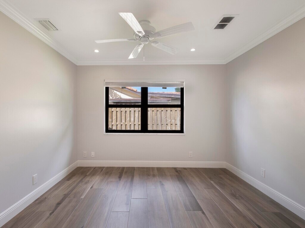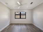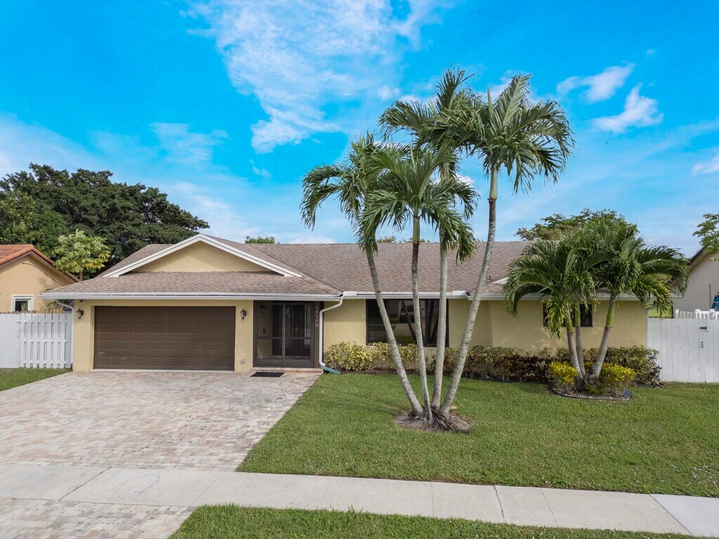 Experience the best of South Florida living in this beautifully upgraded 4-bedroom, 2-bath home featuring a cabana bath, a screened-in pool, and a spacious fenced backyard overlooking the golf course. Set on a 9,614 sq. ft. lot with mango, banana, and jackfruit trees, this property blends elegance, comfort, and functionality.Inside, discover an open and bright floor plan enhanced by modern finishes, crown moldings, and beautiful fans in every room. The expansive living and family areas create an inviting space for entertaining, while the bedroom with double doors offers versatility for guests or a home office. No carpet throughout, just clean, contemporary flooring for easy maintenance.