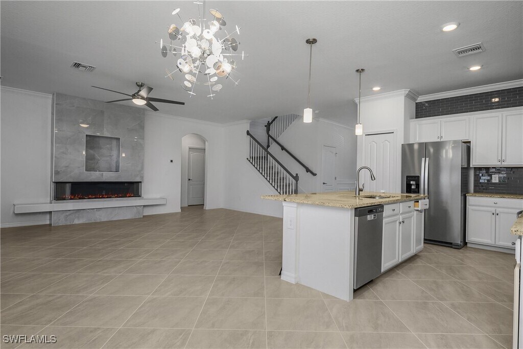 FIRST FLOOR BEDROOM AND BATH!! Highly upgraded 4 Bedroom + Den + Loft on a Rare Double Lot with a Lake View! Available as an Unfurnished Annual Rental in the highly desirable resort-style community,The Place At Corkscrew! WELCOME HOME to this beautifully maintained two-tory floor plan,offering over 2,500 sq. ft. of spacious living,perfectly positioned on a rare double lot with serene lake views. This home is designed for comfort,functionality,and effortless entertaining. Step inside to a bright and open great room showcasing a gorgeous custom marble TV wall with a 3-sided fireplace,sliding glass doors that lead to the large screened-in lanai. The home flows seamlessly into the dining area and a gorgeous chef-inspired kitchen featuring stainless steel appliances,granite countertops,pantry,white shaker cabinetry,custom glass tile backsplash,oversized kitchen island with coordinating glass tile,pendant lights and chandelier. This home features a two-story custom wall,a loft with a custom designed TV wall and an abundance of natural lighting,new custom interior paint throughout the home,new appliances,and a custom mirror and wood accent wall in the dining room. The first floor includes a full bedroom and full bathroom,a den/flex room,and a large family room with sliding glass doors leading out to your lanai—perfect for indoor-outdoor living. Upstairs,the expansive loft offers additional flexible living space ideal for a 2nd living room,media room,playroom,or office. The luxurious primary suite features serene lake views,custom wall,an oversized walk-in closet,dual vanities,a glass-enclosed shower,private bathroom,and an oversized linen closet. The jack and jill 3rd and 4th guest bedroom with a double vanity bathroom,private bathroom,and a tub/shower combo to complete the upper level. Enjoy outdoor when you step outside and enjoy beautiful morning and evening lake views from your lanai and the extended backyard—a rare benefit of this double lot setting. Walk or drive your golf cart to award winning clubhouse with an abundance of resort-style amenties! This home truly embraces the vacation lifestyle. The Place at Corkscrew boast unsurpassed amenities with a lagoon resort-style pool with a 100 ft. waterslide,two waterfalls & two zero-entry points,Lifeguard on duty,cabanas,40-person spa,kids splashpad,sand volleyball,two-story fitness center,movement & yoga room,spa treatment room,indoor/outdoor restaurant & bar,poolside food and beverage service,Café & marketplace,Adults-only bourbon bar,Pickleball,tennis,basketball,bocce,dog park,playground and so much more! Conveniently located near RSW International Airport,shopping,dining,FGCU,entertainment,and the stunning beaches of Southwest Florida. Available as an unfurnished annual rental.