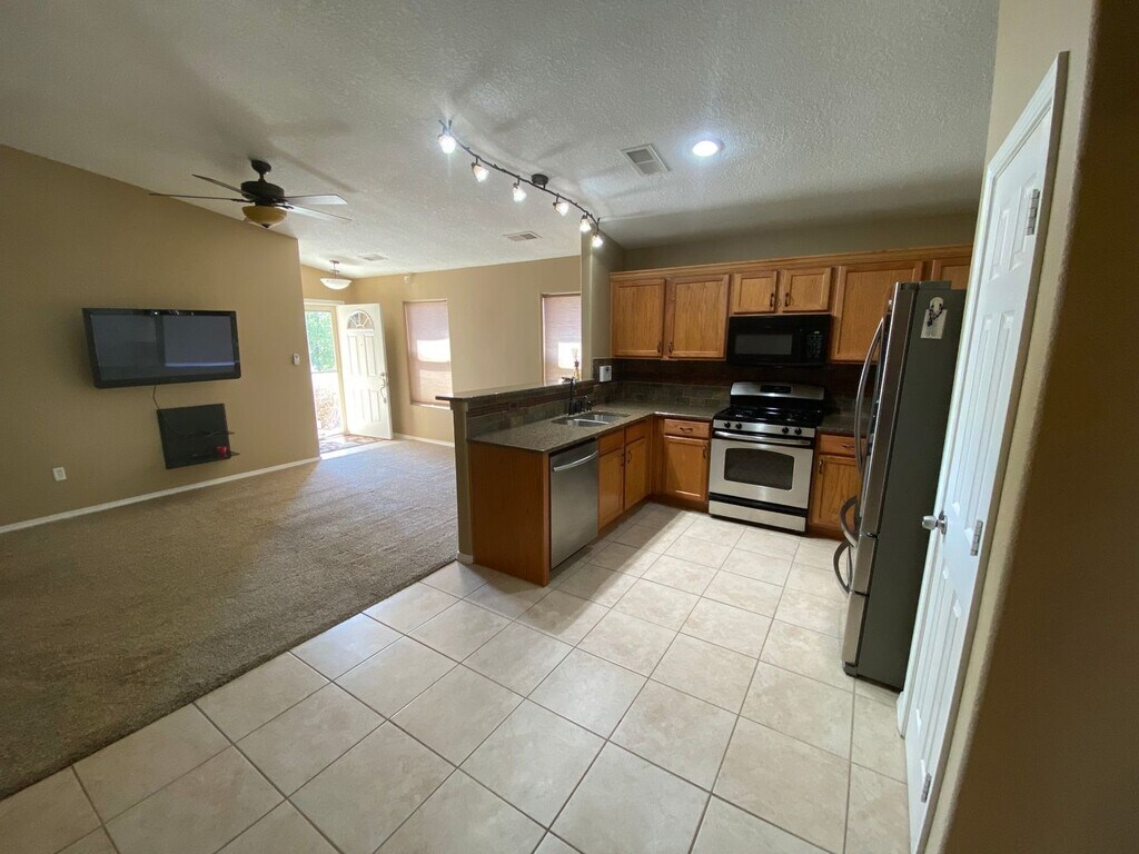 1952 Mesa Grande Loop NE in Rio Rancho offers a well-maintained 3-bedroom plus bonus room, 2-bath home with practical features throughout. The kitchen includes stainless steel appliances, gas range, microwave, dishwasher, disposal, refrigerator, pantry and granite countertops. Living areas have carpet and tile in wet areas, ceiling fans and blinds. The master bath offers a double sink and the property includes refrigerated air, gas heat, a laundry room with washer/dryer hookups, and a 2-car garage with opener. Outside is a covered patio, walled backyard, and low-maintenance southwest landscaping with landscaped front and back. Renters pay all utilities; pets are not allowed. A 1-year lease is required, along with renters insurance and a $145 lease administrative fee due at lease execution.