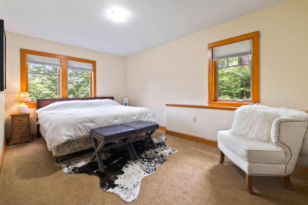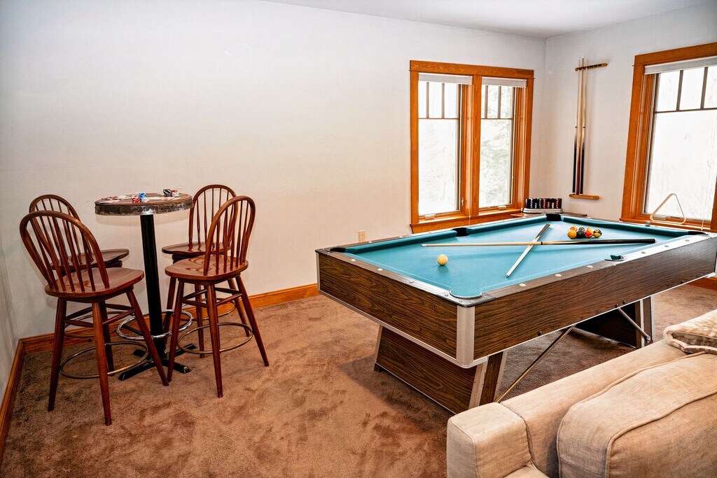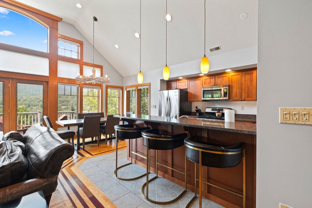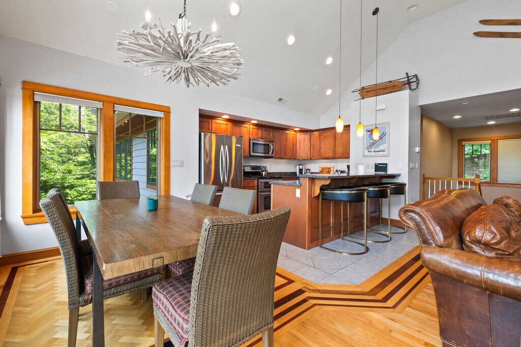 Prepare to be enchanted by a gorgeous retreat designed to create an ambiance of unparalleled comfort and luxury. Nestled near Lincoln, NH, this 7-bedroom 4-bathroom gem is a masterpiece of interior aesthetics, offering an extraordinary family getaway in the magical Loon Mountain. With three living rooms, two full kitchens, and a game room featuring arcade, pool, and poker, this home is perfect for relaxation and entertainment. Enjoy the patio and deck with a hot tub and fire pits, and feel at home with smart TVs and garage access with an EV charger. Pets are welcome too! This professionally designed 7-bedroom getaway is a symphony of elegance, sophistication, and comfort near the picturesque Lincoln, NH. It is comprised of the 5-bedroom Main House and a 2-bedroom In-Law Suite, along with a plethora of additional facilities. The open floor plan living space of the main house is a testament to the harmonious blend of form and entertainment, with bespoke furnishings, vaulted ceilings, modern lighting fixtures, and comfortable areas that allow you to unwind at any time of day. Enjoy the gourmet kitchen's stainless steel appliances and a central bar for culinary delights. Unwind in the stylish living room and pamper yourself in the seven stunning bedrooms and four spa-like bathrooms. This stunning property will delight you with its entertaining game room and mesmerizing outdoors, boasting luxurious and pampering amenities like a hot tub, two fire pits, a brand-new putting green, and breathtaking views that will make you want to stay forever. Pets are welcome with a fee of $250 per dog. Dogs must be well-behaved, fully house-trained, and kept on a leash while outside the property. Ensure that dogs are crated when alone in the house to prevent any damage and ensure their safety. Guests are responsible for cleaning up after their dogs, both inside and outside the property. To maintain the quality of our luxury home, we kindly ask that pets remain off furniture and beds. This luxurious ski property sits in the heart of the White Mountains in South Peak near Lincoln, NH, just at the base of Loon Mountain and a few steps away from the ski resort. This vacation haven offers the perfect blend of relaxation, adventure, and breathtaking natural beauty with year-round activities for guests of all ages. Winter invites endless fun on world-class skiing and snowboarding slopes, while the warmer months open doors to scenic hiking trails, exhilarating gondola rides, and refreshing kayaking and swimming in nearby rivers and lakes. Just minutes away, the charming town of Woodstock awaits with its quaint shops, cozy cafes, lively breweries, and exceptional dining options, perfect for soaking up the welcoming New England atmosphere after a day of exploration. With numerous pet-friendly trails and open spaces, your furry companions will love every moment of this mountain escape too. For those eager to explore further, the location offers convenient access to Waterville Valley and Cannon Mountain, expanding your adventure possibilities with more spectacular landscapes and outdoor activities. Your ideal trip can include thrilling outdoor pursuits or peaceful moments surrounded by nature, and this White Mountains destination promises memorable experiences for the whole family, including every member and your pets. Smoking inside the home is prohibited and any evidence of smoking will result in a $2,000 fee for odor removal and furniture cleaning. No parties or events are allowed to preserve the pristine condition of the home for future guests and your return visits. A digital guidebook will be provided prior to check-in with additional information about the house and local recommendations. Registration Number: STR24-00037