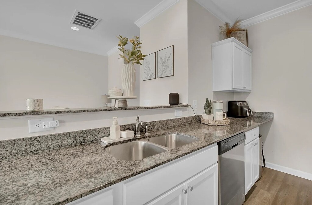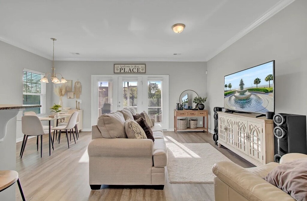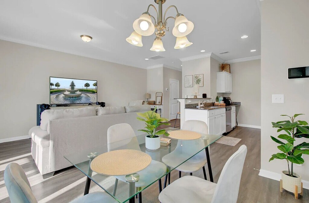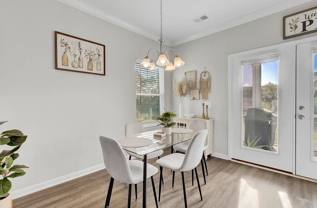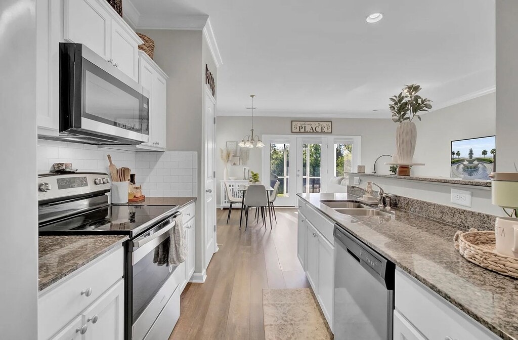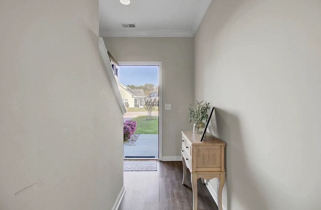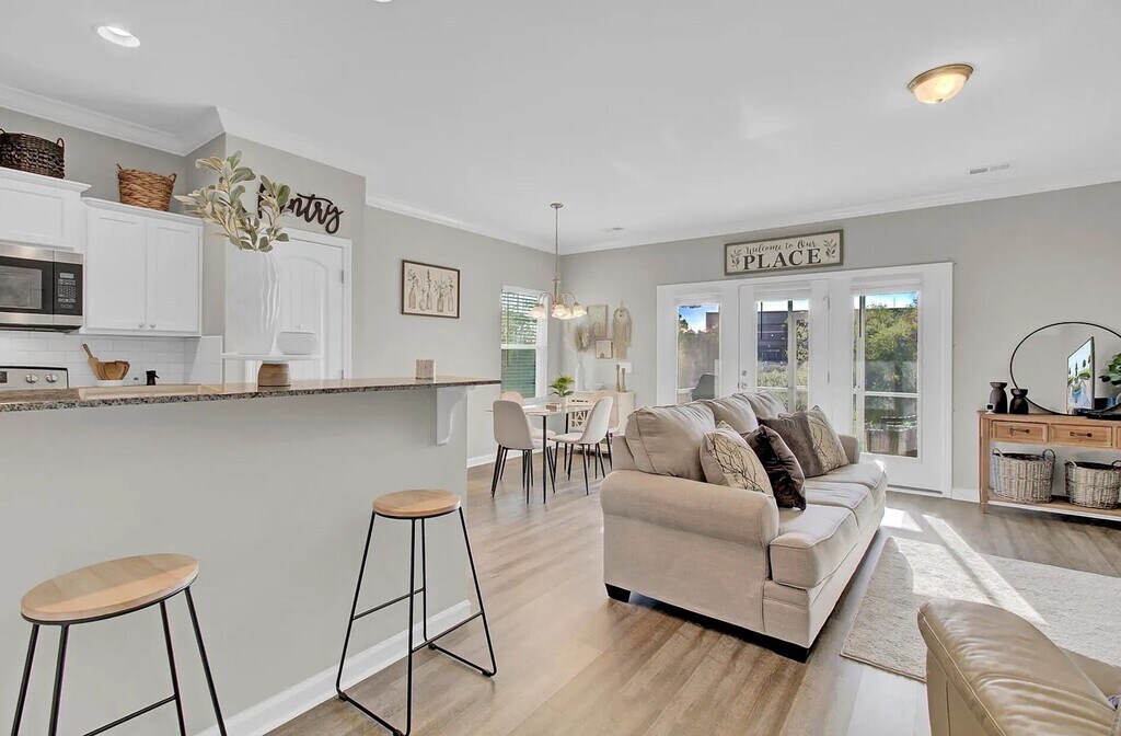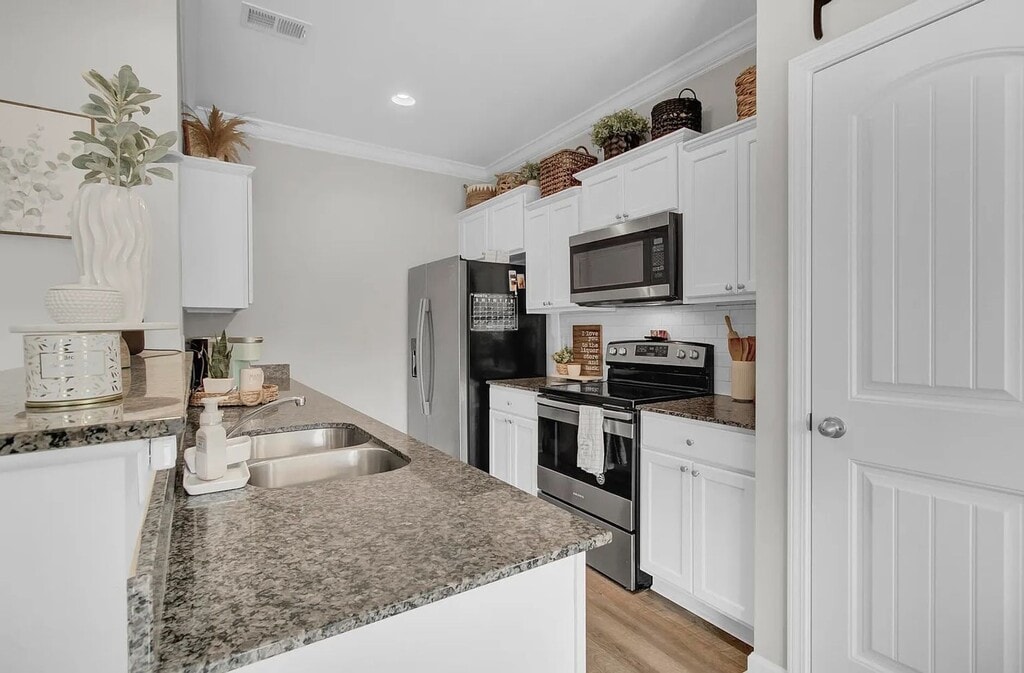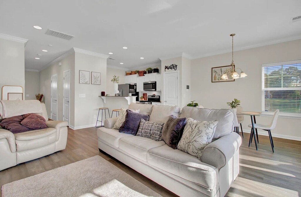 - 3 Bedroom 2.5 Bath Townhouse in Lakeview Commons - Goose Creek - 1512 SQFT - Built 2019 - Desirable end unit - Open floor plan - Great natural light - Smooth ceilings with crown molding - Luxury vinyl plank flooring downstairs - Wall-to-wall carpet upstairs - Upgraded kitchen - Stainless steel appliances - Granite countertops - Master suite upstairs - Dual walk-in closets - Dual sinks in master bath - Washer & dryer upstairs - Screened-in patio overlooking pond - Single car garage - Community pool, clubhouse and playground - No smoking - Pets negotiable - Available early May