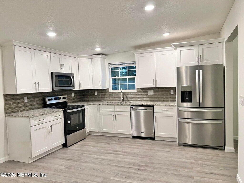 Amazing property split into TWO HOMES! This unique floor plan is a MUST SEE! It has a private entrance for each residence. The elevated level has 3 bedrooms & 1 bath. The lower level has 2 Bedrooms,1 bath plus a bonus room/office. Totally remodeled interior with new flooring,paint and light fixtures. Both kitchens are a chef's dream featuring granite countertops,deep sinks,nice faucets,white cabinets and modern stainless steel appliance packages! The bathrooms are unique with new tile,vanities,and toilets. The back yard is HUGE and perfect for entertaining! In between the units,there is a 1 car garage and a spacious shared laundry room. Plenty of parking in front plus extra parking space for a boat. The UTILITIES ARE NOT SEPARATED,this shared home is ideal for roommates or a family with in laws or college students. Centrally located under 10 miles from the Jacksonville Beaches,St. John's Town Center,and Downtown Jacksonville! Call today to prequalify to show. MLS# 2132972
