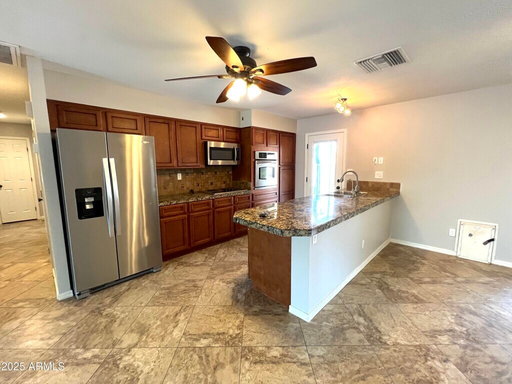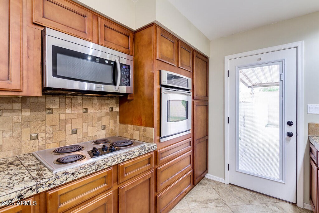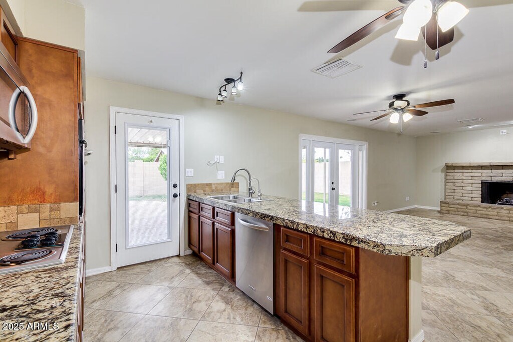 AVAILABLE 8/1! Single level home on a large,corner lot with low maintenance desert landscaping in the front. Open,spacious floor plan with 3 bedrooms,2 bathrooms and a 2 car garage with built in cabinets and room for an RV or boat. Front door opens up to bright,open living room where 20'' tile,two-tone paint and upgraded hardware creates a beautiful presentation. Kitchen is gorgeous with dark maple cabinets,granite slab counters,tile back splash and stainless steel appliances including wall oven and built in microwave. Kitchen has tons of cabinet space and there is a pantry for even more storage! Kitchen overlooks great room with wood burning brick fireplace and french double doors which lead to backyard. Master suite has wood laminate floors and tile shower. Additional bedrooms are very spacious and have tile floors and ceiling fans. Large backyard has big grassy area with mature citrus trees,big covered patio and fully fenced sparkling pool.
