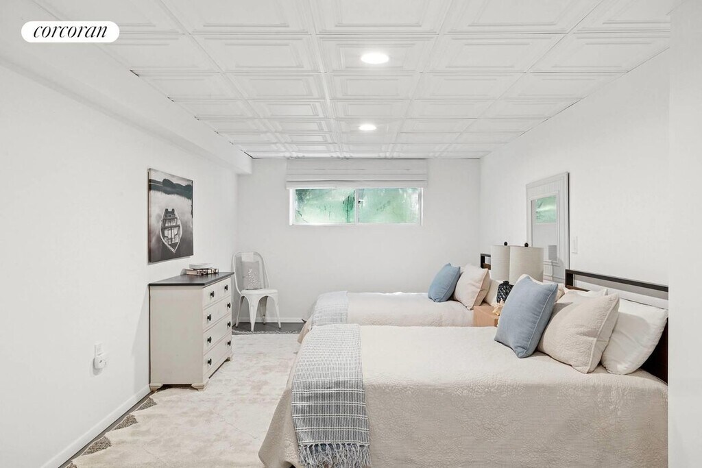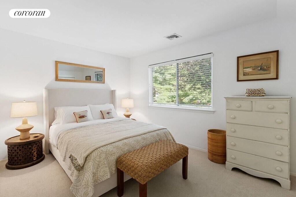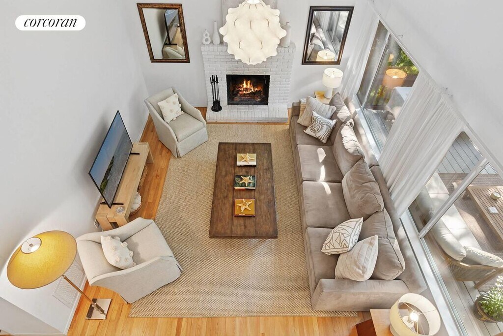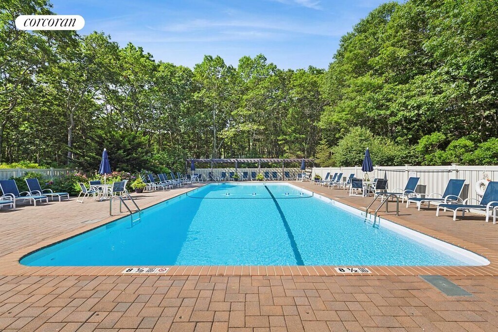 A long expanse of beautifully landscaped grounds welcomes you to 197 Treescape 9D, a crisp corner unit recently updated with designer finishes distinguish this 3 bed, 2 bath home with a spillover area and media lounge in the finished basement. The open floor plan features a wood-burning fireplace and cathedral ceilings as well as an 11' sofa in the Living room and Dining Room table for 8-perfect for relaxed gatherings with family and friends. Coastal decor defines the vibe throughout. The enormous kitchen is set up for gourmet meal preparation and opens up onto a beautiful deck overlooking natural beauty and lush greenery. The deck is outfitted with a comfortable seating area and large dining room table as well as a stainless steel gas grill for lots of outdoor feasting and reminiscing. The primary bedroom features a king sized bed and two large windows overlooking treetops. The dressing room off the primary bedroom boasts an enormous closet as well as a set of free weights, kettleballs, floor length mirror and yoga mat for your work out needs. The other two bedrooms feature queen sized beds and large closets. The bathrooms are newly renovated with clean modern fixtures. The Treescape complex boasts an Olympic sized swimming pool, two tennis courts and a pickle ball court-all for guest use. Come and enjoy this serene verdant gem just minutes from East Hampton town. An 8 minute drive to ocean beaches, 10 minutes to bay beaches, 7 minutes to East Hampton town center and 15 to Sag Harbor--this home is centrally located while situated in a quiet and tranquil oasis.