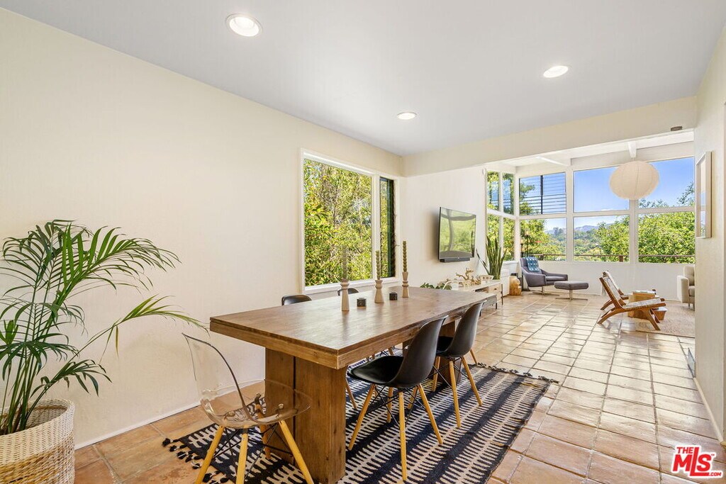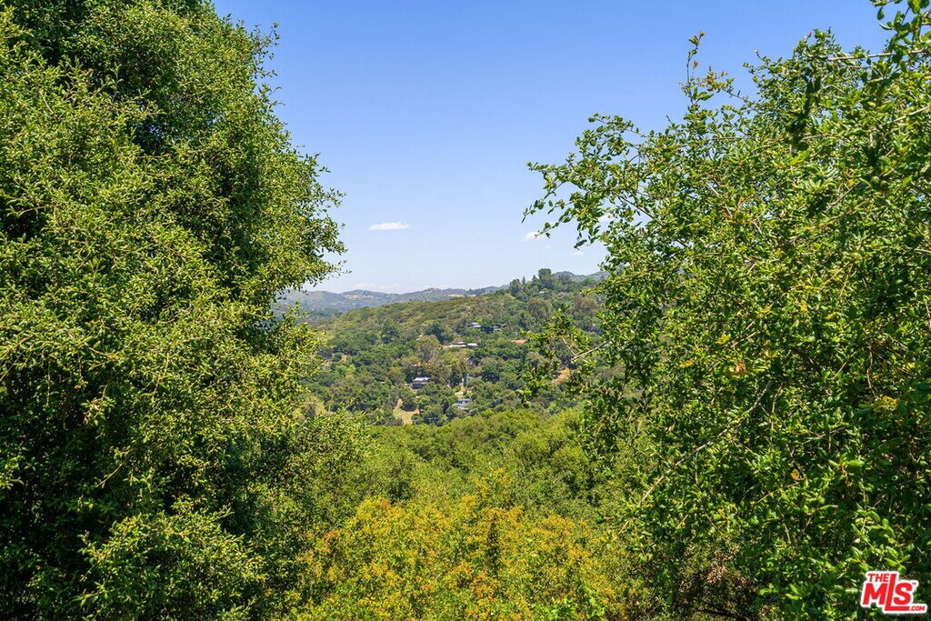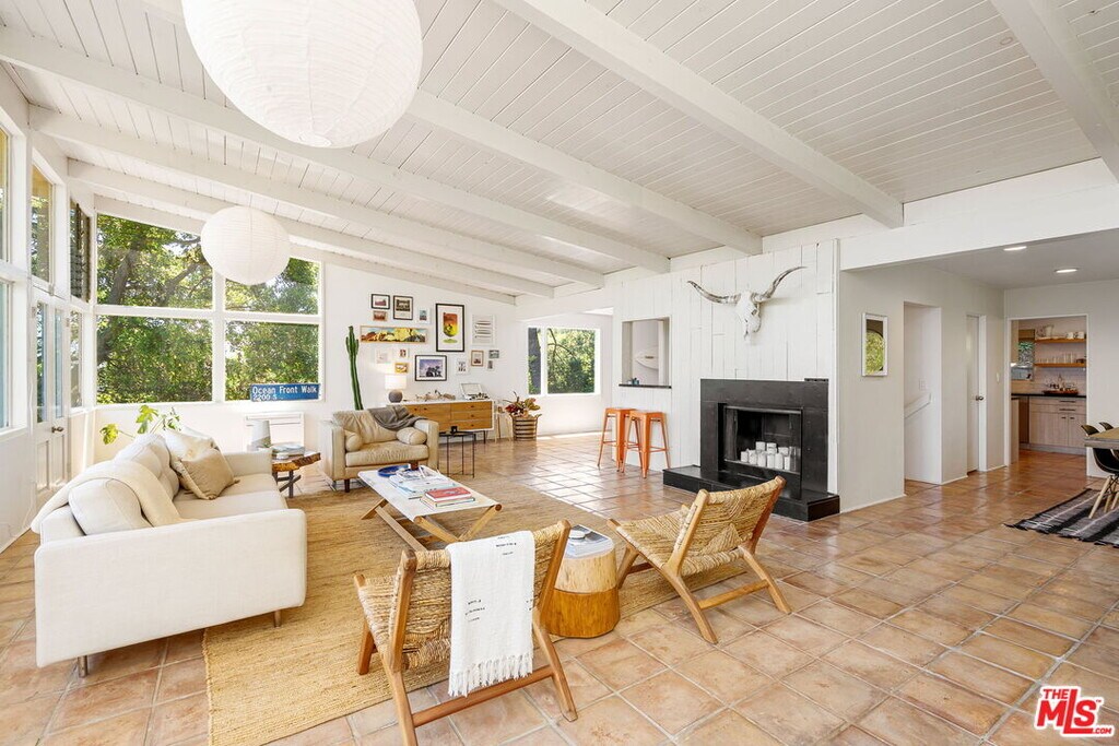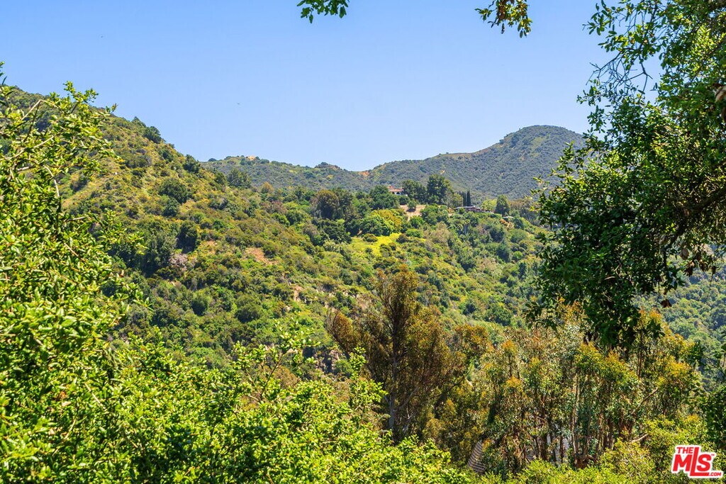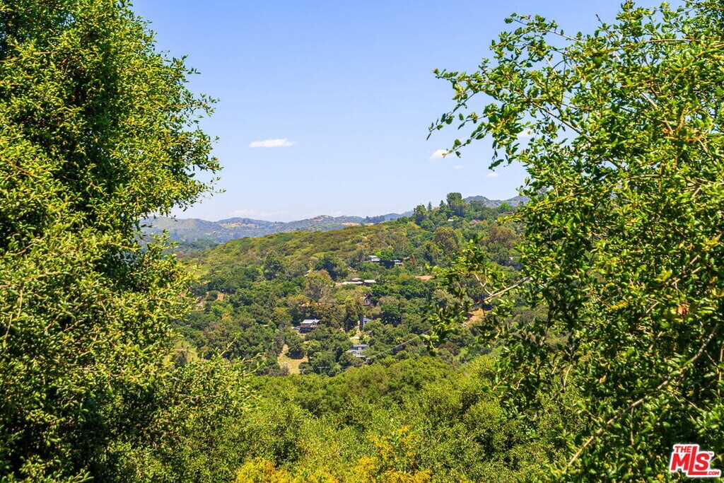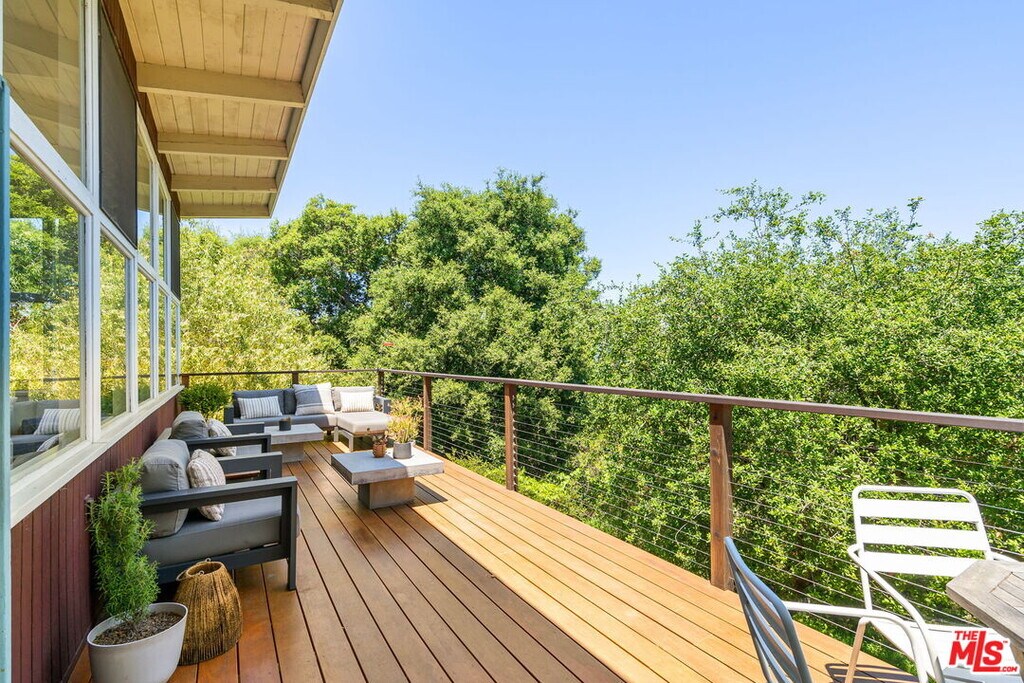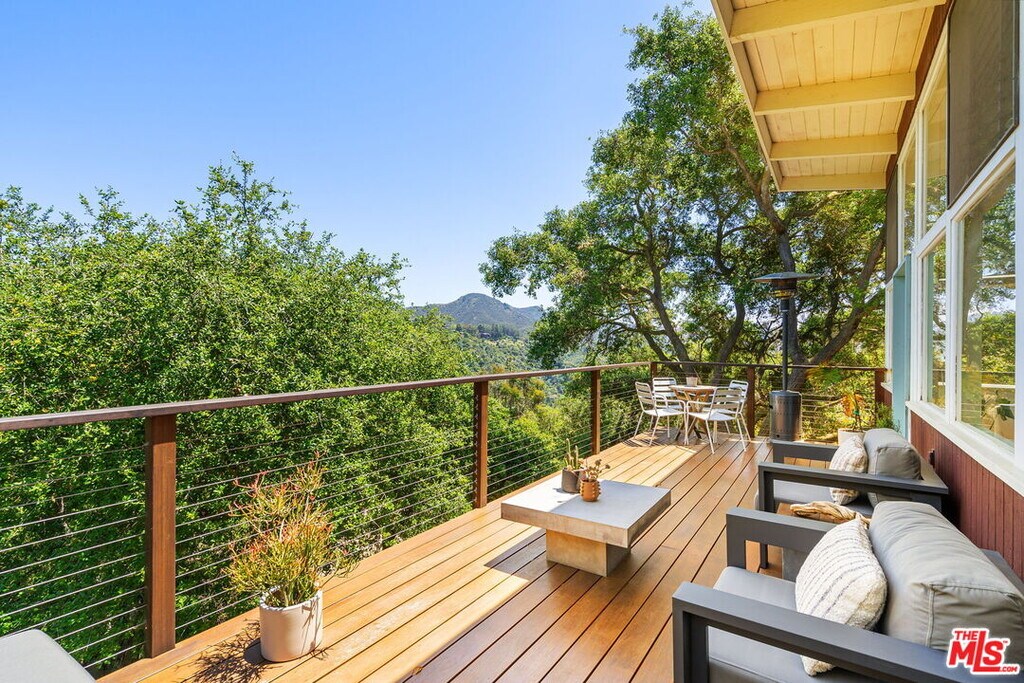 Tucked away in the serene Topanga Mountains, this 2-bedroom, 2-bathroom home offers a peaceful retreat with stunning views. The interior boasts an oversized living room with pitched wood-beam ceilings, a cozy fireplace, a bar area, and an impressive wall of glass windows and doors that open to an expansive deck overlooking verdant treetops, canyons, and hills beyond. The dining room flows into a modern chef's kitchen equipped with stainless steel appliances, a subway tile backsplash, exposed shelving, ample cabinet space, and a breakfast area. The primary bedroom is a haven of relaxation with a walk-in closet and glass doors showcasing serene views of mature trees. The modern primary bathroom features a soaking tub, separate glass shower, and dual-sink vanity. Additional highlights include a spacious guest bedroom, polished concrete and Saltillo tile flooring, an abundance of windows and natural light, and a tiered backyard with two different outdoor spaces. A peaceful escape from the hustle and bustle of city life, yet close to everything Los Angeles has to offer, don't miss the opportunity to call this Topanga Canyon sanctuary your own. MLS# 26732693