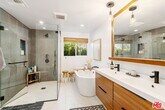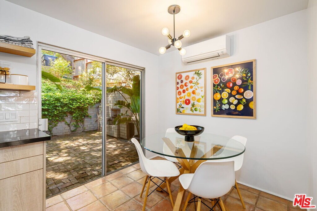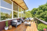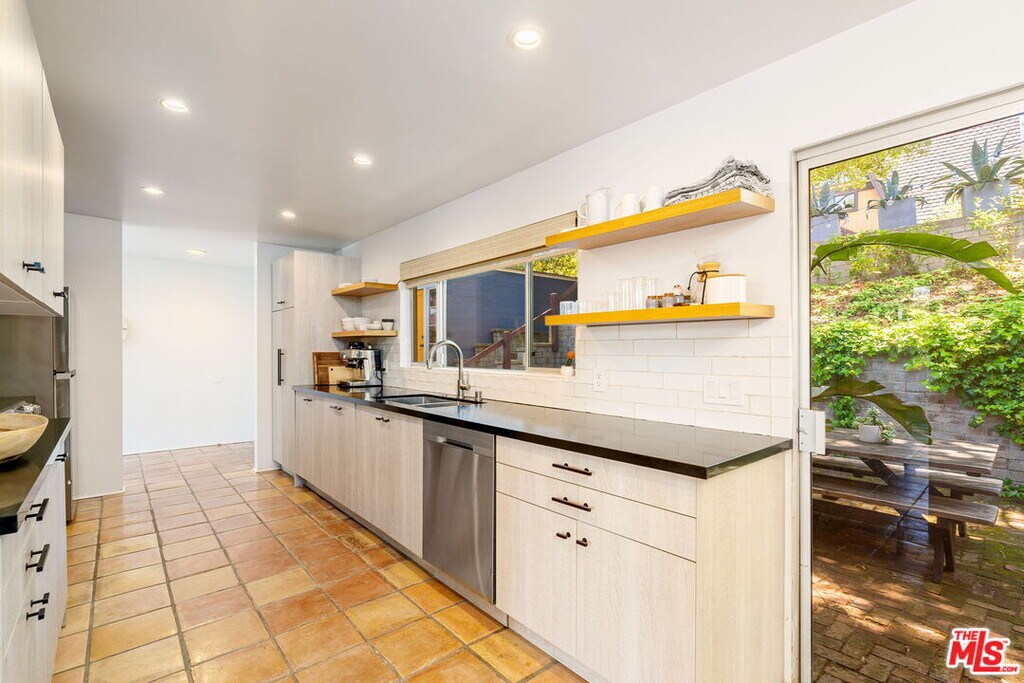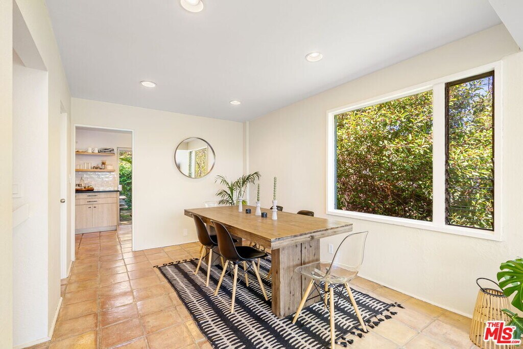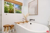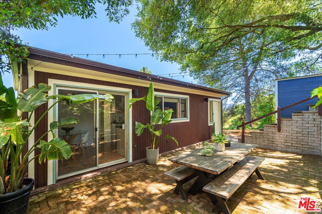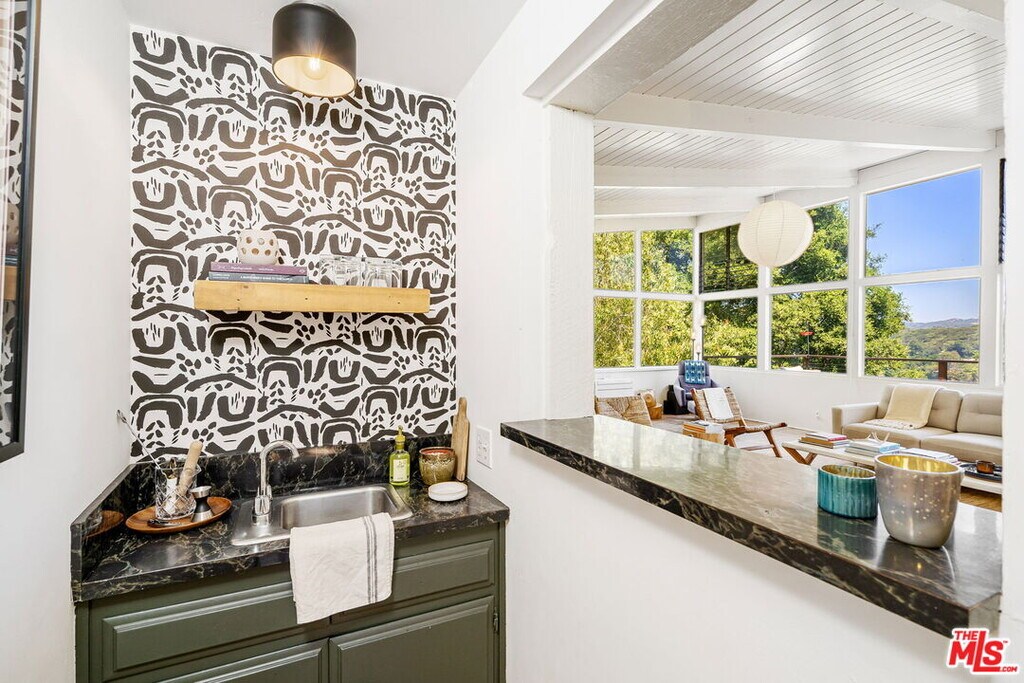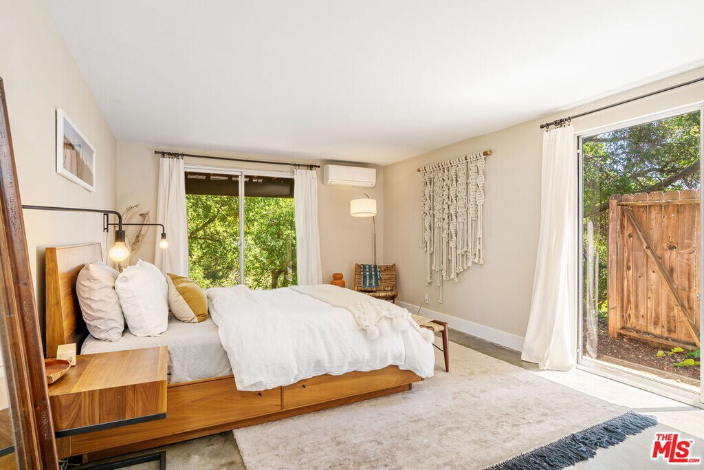 Tucked away in the serene Topanga Mountains, this 2-bedroom, 2-bathroom home offers a peaceful retreat with stunning views. The interior boasts an oversized living room with pitched wood-beam ceilings, a cozy fireplace, a bar area, and an impressive wall of glass windows and doors that open to an expansive deck overlooking verdant treetops, canyons, and hills beyond. The dining room flows into a modern chef's kitchen equipped with stainless steel appliances, a subway tile backsplash, exposed shelving, ample cabinet space, and a breakfast area. The primary bedroom is a haven of relaxation with a walk-in closet and glass doors showcasing serene views of mature trees. The modern primary bathroom features a soaking tub, separate glass shower, and dual-sink vanity. Additional highlights include a spacious guest bedroom, polished concrete and Saltillo tile flooring, an abundance of windows and natural light, and a tiered backyard with two different outdoor spaces. A peaceful escape from the hustle and bustle of city life, yet close to everything Los Angeles has to offer, don't miss the opportunity to call this Topanga Canyon sanctuary your own. MLS# 26732693