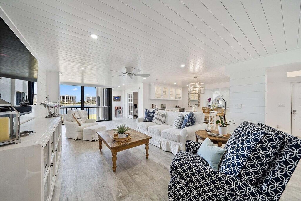 Completely renovated coastal-styled condo with unobstructed Caribbean blue Intracoastal views! Offered turnkey furnished, including designer furnishings, artwork, linens and fully outfitted kitchen. The architecturally re-imagined floorplan offers a split bedroom design, custom bar and service area with backlit, glass paneled cabinetry, dual beverage coolers, gorgeous quartzite countertops and upgraded stainless appliance package. Move right into this light and refreshing home and instantly sense the luxurious south Florida lifestyle it offers. Amenities include a day dock/fishing pier, sandy beach areas for kayak and paddle board storage, inside bike and board storage, tennis courts, heated pool right next to the Intracoastal Waterway, community Weber grills and a modern clubhouse