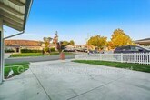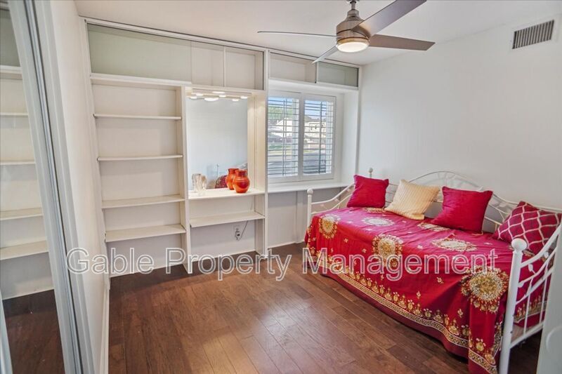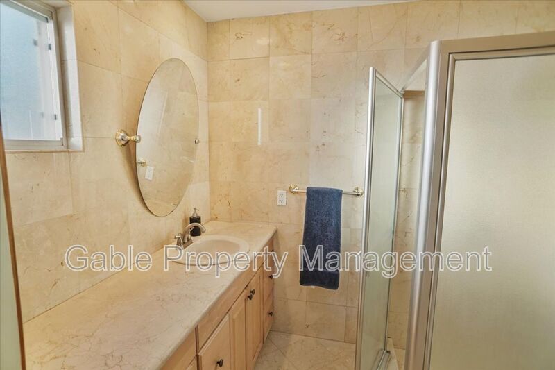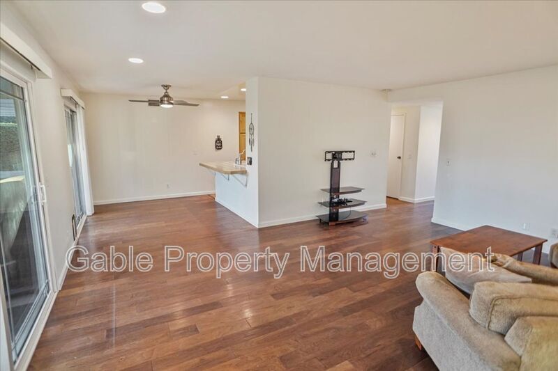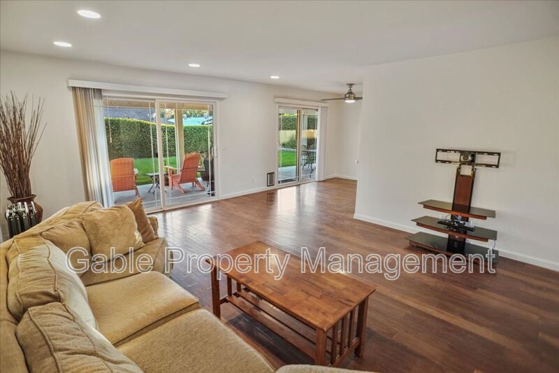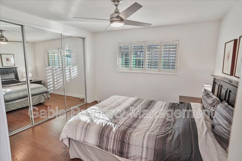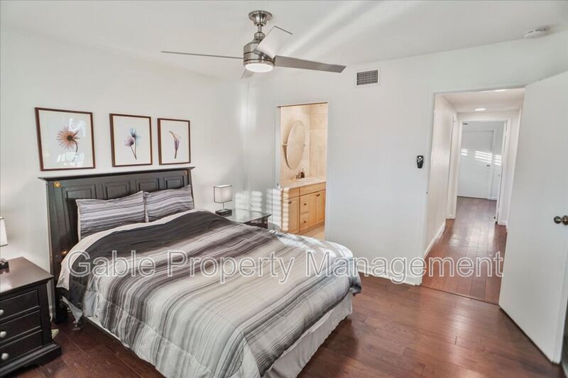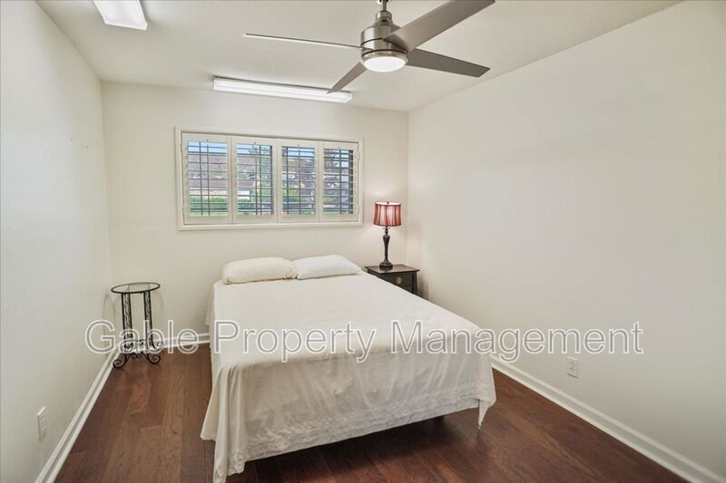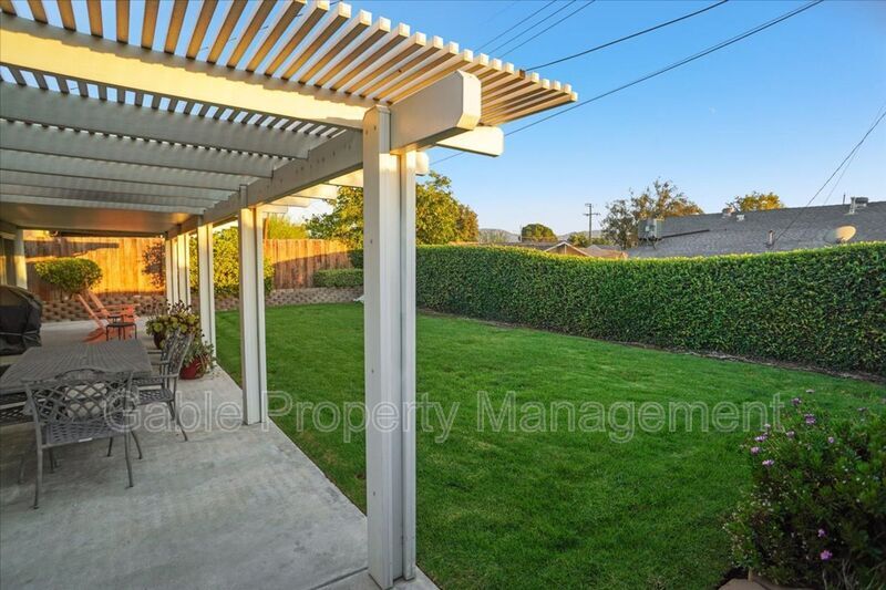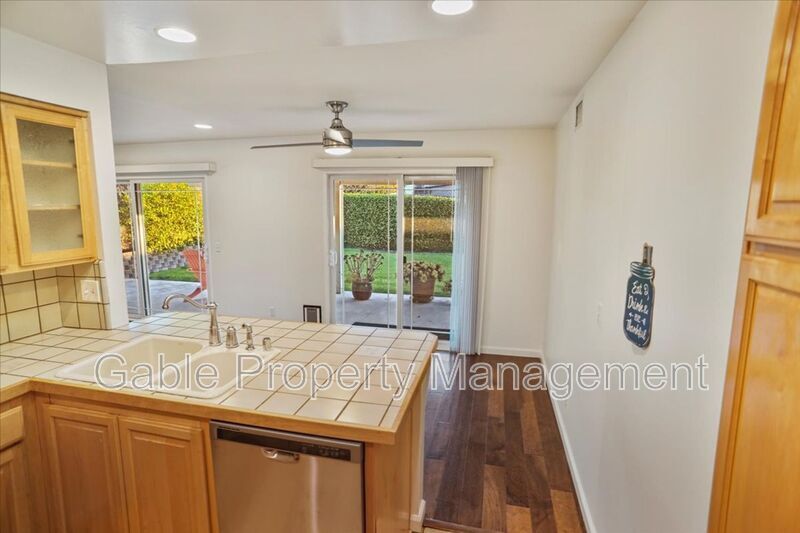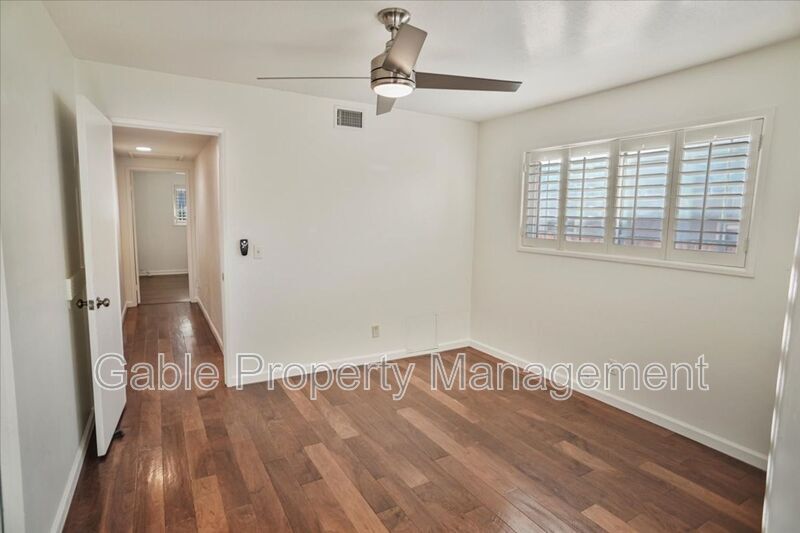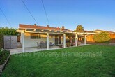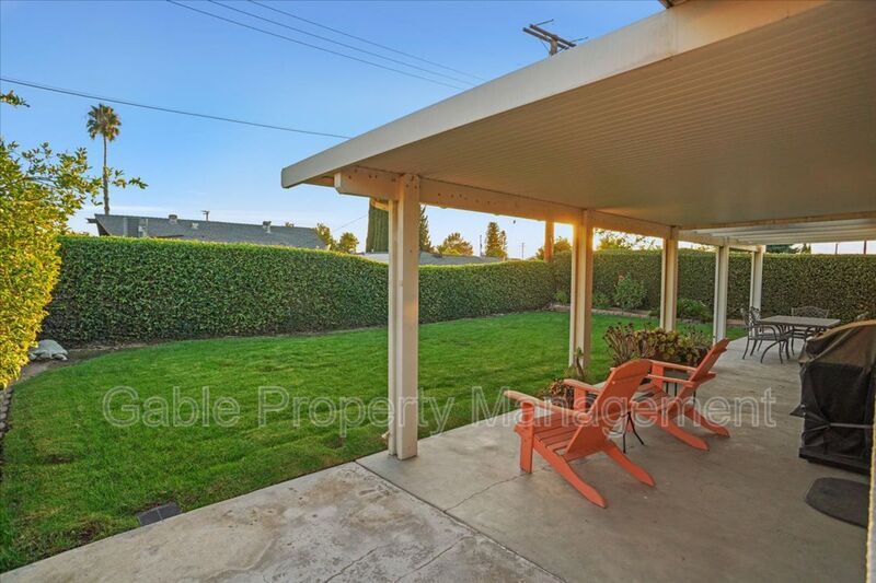 Welcome to this charming single-story home featuring great curb appeal with lush green landscaping and a wide driveway. Step inside to a spacious living room with recessed lighting, abundant natural light, laminate wood flooring throughout, and no carpet. The open kitchen offers custom cabinetry with plenty of storage, stainless steel appliances, and a convenient breakfast bar that opens to the dining area with a ceiling fan—perfect for entertaining. This home offers four generously sized bedrooms, each with ceiling fans, including a spacious primary suite with an upgraded bathroom featuring custom tile work, a modern vanity, and a walk-in shower. The hallway bathroom is beautifully updated with a stylish vanity and shower/tub combo. Enjoy the beautifully maintained backyard with a covered patio, grassy area, and a storage shed—ideal for relaxing or outdoor gatherings. Additional highlights include a two-car attached garage and proximity to excellent schools, parks, shopping, restaurants, and freeway access.