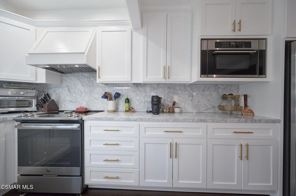 Stylish and remodeled, this light-filled Thousand Oaks East townhome offers sophisticated living, with everything you need close by. Enter through a large, gated front patio into a stylish main living space, featuring rich espresso-hued hardwood flooring, a sunny window seat, built-in desk, shelving and a cozy fireplace. A formal dining room flows seamlessly into the decorator perfect eat-in kitchen with crisp white cabinetry, marble counter-tops, stainless steel appliances and a center island with breakfast bar. An adjacent dry bar with a built-in wine rack enhances your entertaining. Enjoy al fresco dining on the private rear patio illuminated by twinkling overhead lights. There's a chic renovated powder room on the main level as well. Upstairs, the spacious primary suite impresses with vaulted ceiling, balcony and generously sized walk-in closet. En-suite bathroom with oversized vanity and tub/shower, plus 2 additional bedrooms and remodeled full shared bath. Large 2-car garage provides ample storage and the washer and dryer completes this attractive, move-in ready home. Sparkling community pool, tennis/pickle also. Available furnished or unfurnished. Ultra convenient to shopping, cafes, great dining, entertainment and services, excellent Conejo Unified schools, parks, playgrounds, miles of trails and a dog park are right down the street. Easy access to 23 & 101 Freeways.