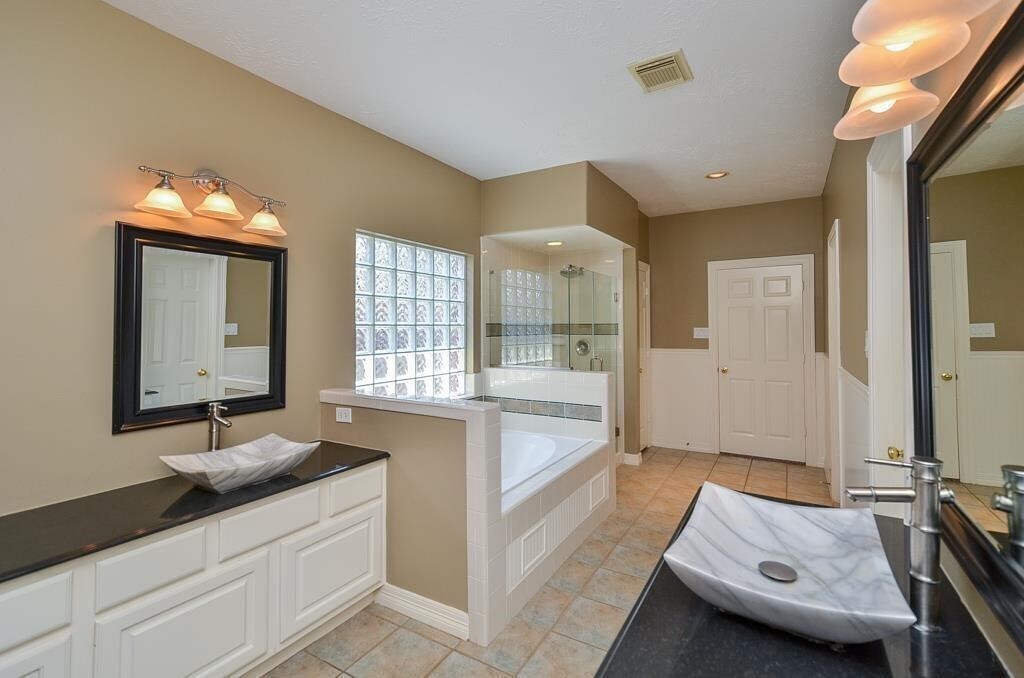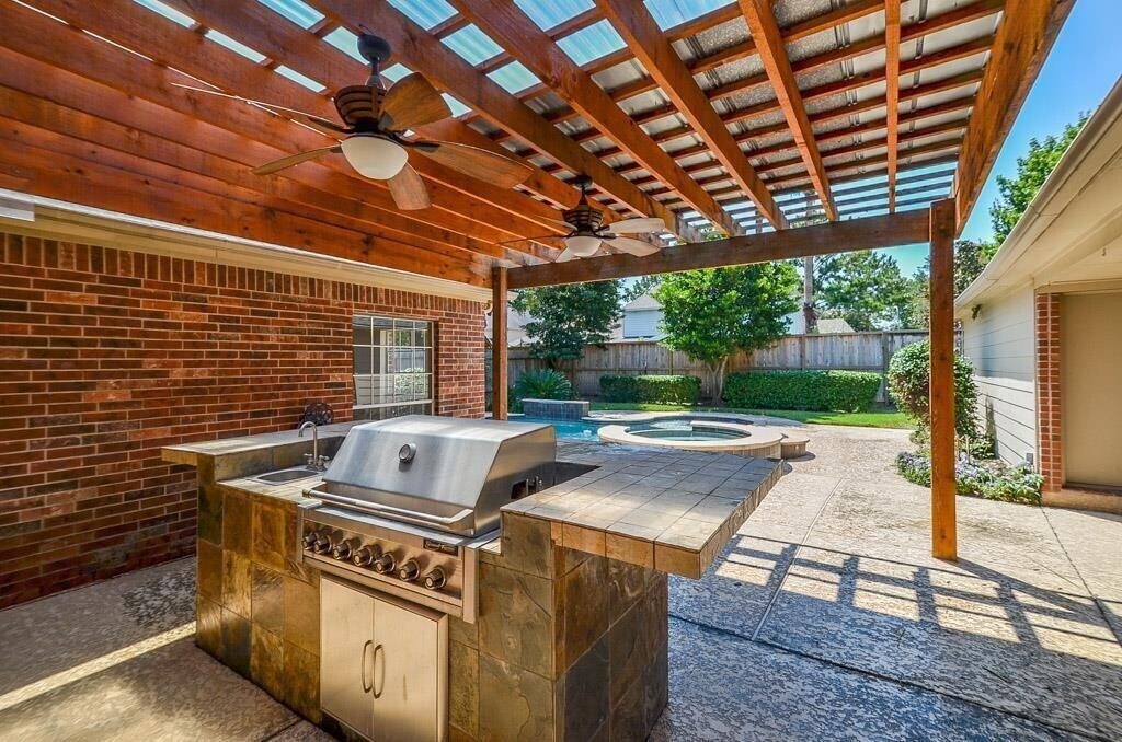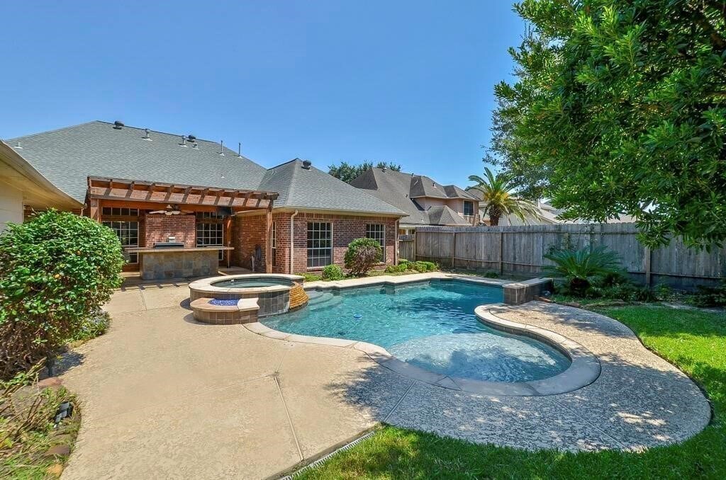 LARGE WONDERFULLY MAINTAINED 1 STORY HOME WITH POOL & SPA! HOME FEATURES HIGH CEILINGS,GAS LOG FIREPLACE,3 CAR DETACHED GARAGE,COVERED BACKYARD PATIO W/OUT DOOR GRILL AND BAR! TILE FLOORS THROUGHOUT! NO CARPET IN HOUSE. FRESHLY PAINTED! LARGE CLOSETS! ISLAND KITCHEN WITH GRANITE COUNTER TOPS! RECESSED LIGHTING! GREAT FLOOR-PLAN WITH SPLIT BEDROOMS! LRG PRIMARY OVER LOOKING POOL,SEAMLESS SHOWER & WHIRL POOL TUB,DOUBLE SINKS & HUGE WALK-IN CLOSET W/BUILT-INS! THE ROOM IN FRONT COULD BE OFFICE/LIBRARY/FORMAL LIVING YOU DECIDE. LARGE LAUNDRY ROOM W/SINK! FULL SZ WASHER AND DRYER. BOSCH FRIDGE! KITCHEN STAINLESS STEAL FARM SINK! KISD! W/PATTISON ELE. JUST ACROSS THE STREET! GREAT LOCATION! CLOSE TO SHOPPING & I-10! POOL AND YARD SERVICE INCLUDED! MLS# 97962302