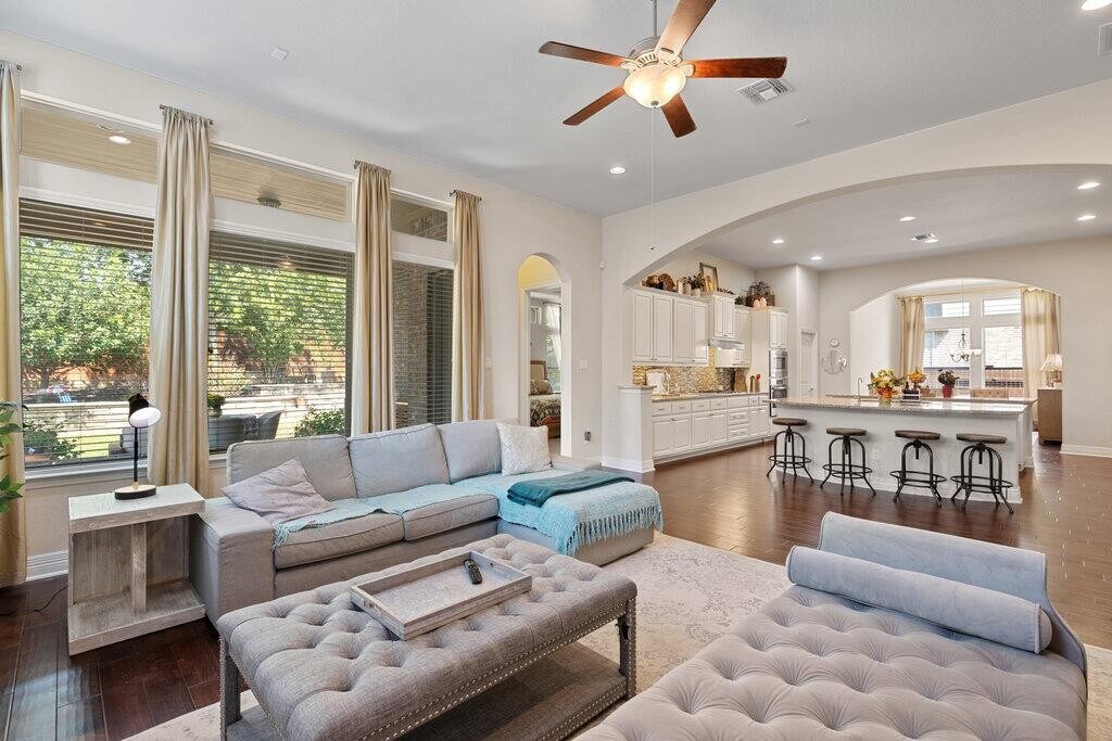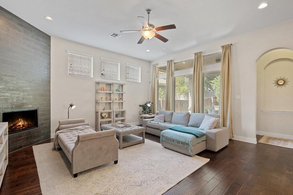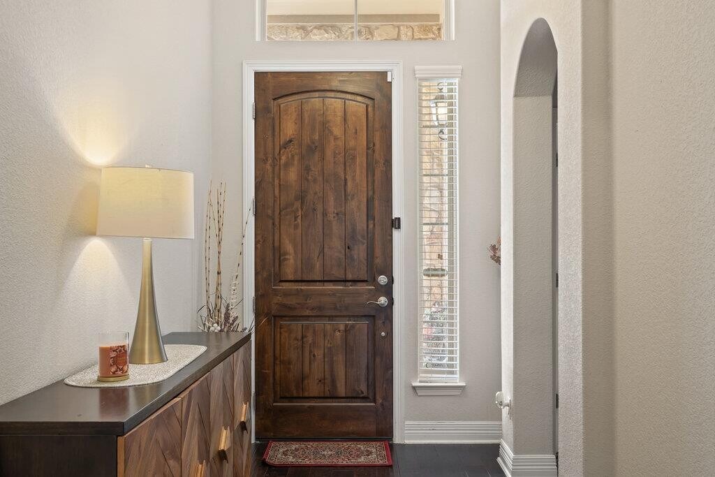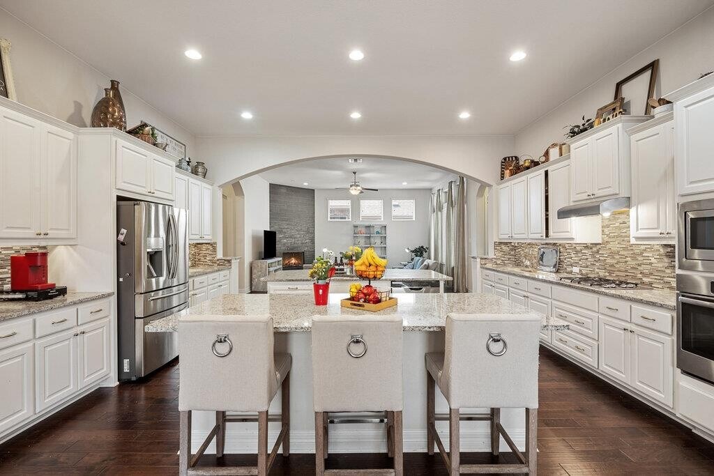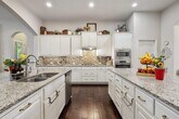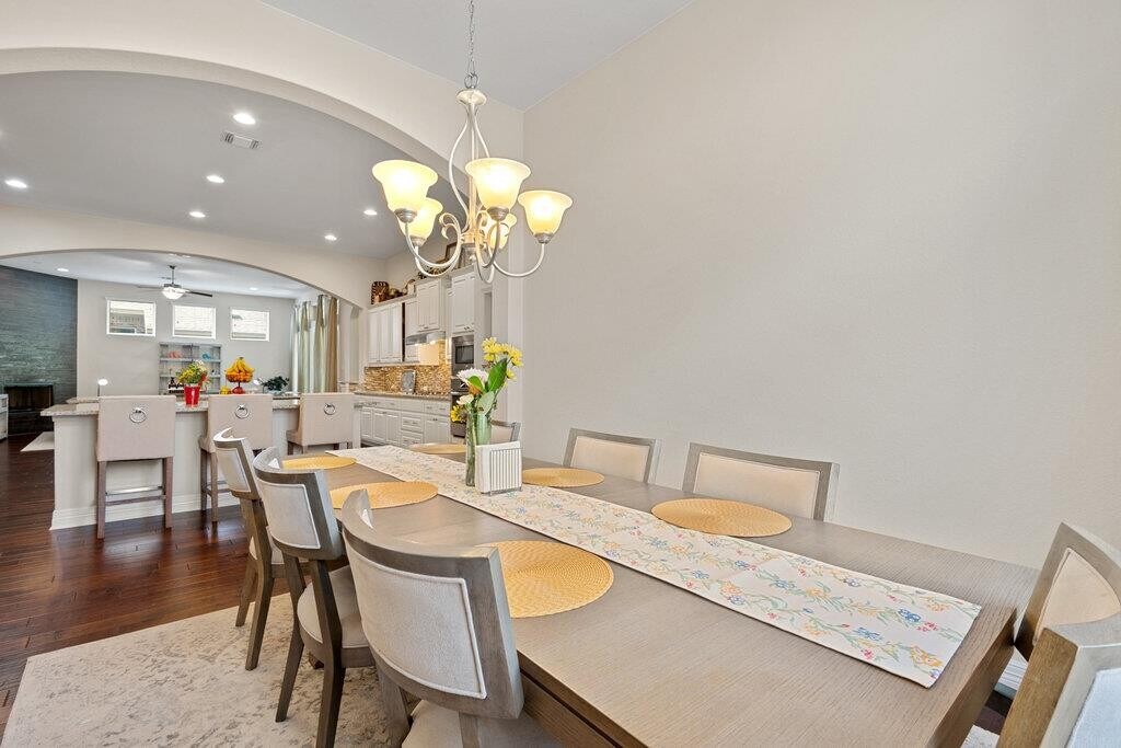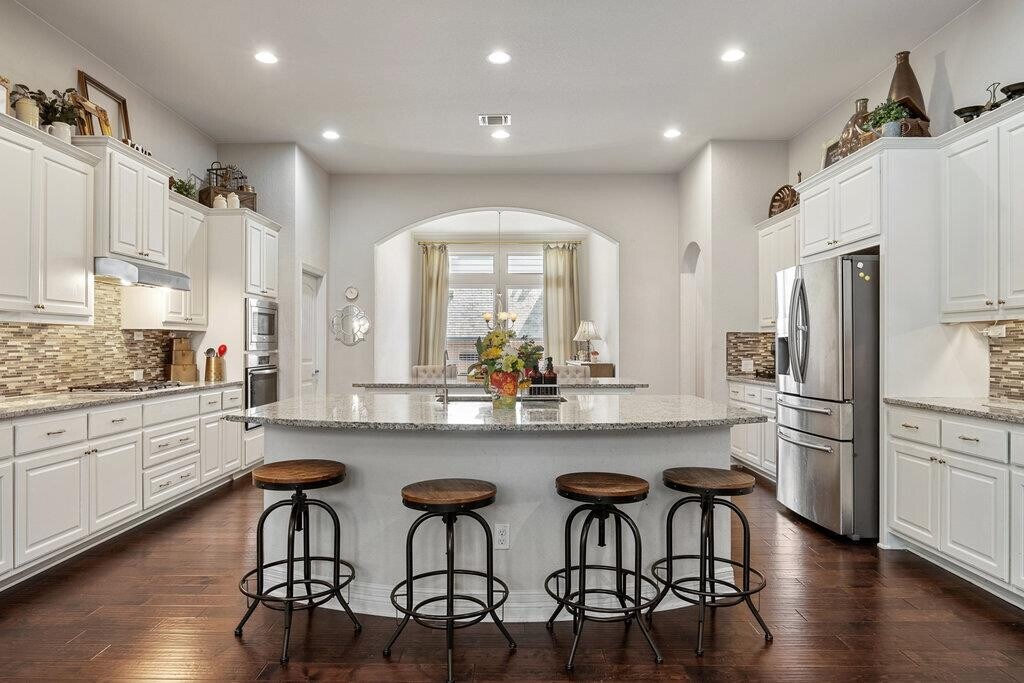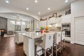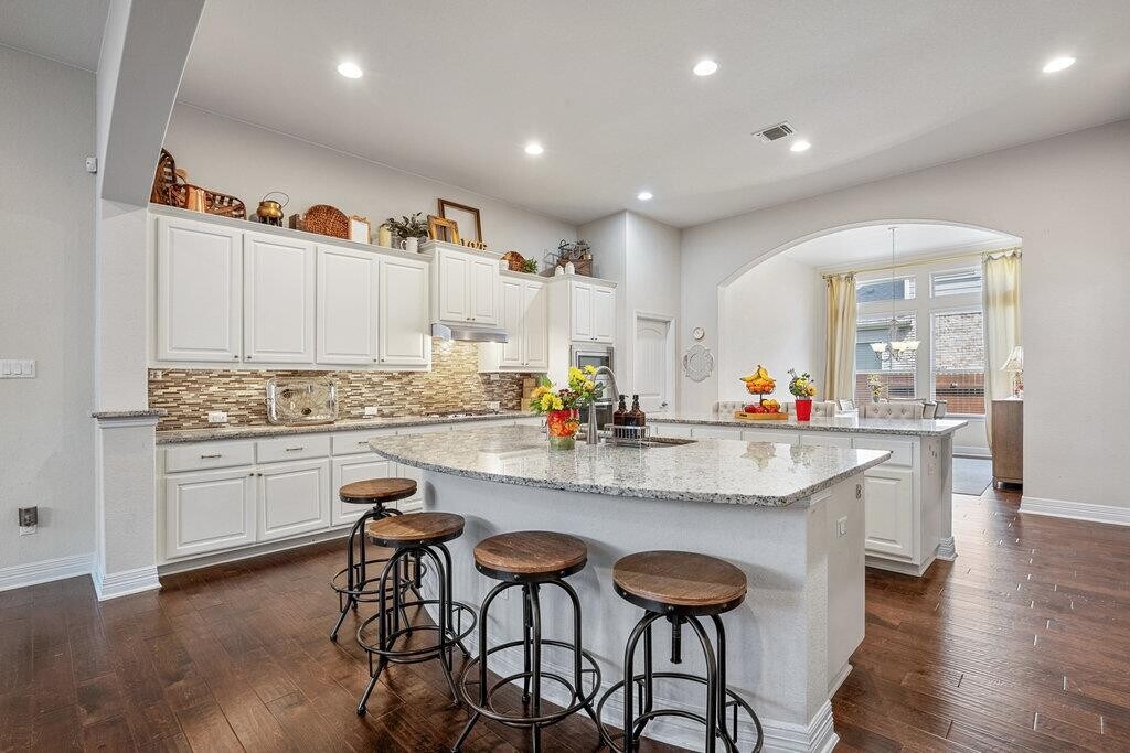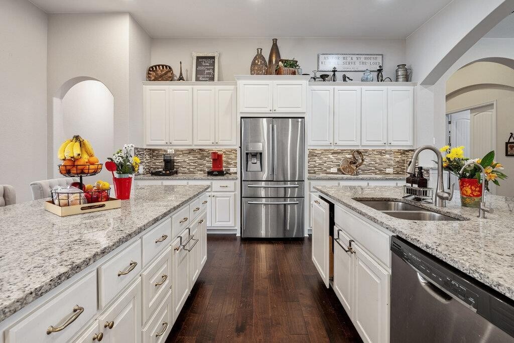Beautiful home with 4 bedrooms, including 2 private suites and 3.5 bathrooms, features an inviting covered front porch that leads to an impressive foyer, a French door home office and a living room. An open-concept layout from a huge living room with cozy fireplace to a formal dining room and a chef’s dream kitchen featuring two oversized islands, ample cabinetry, and countertops, which is perfect for meal preparation or multiple simultaneous culinary projects. The primary bathroom features a separate shower and garden tub, a large walk-in closet, and two separate vanities. Relax under the cozy covered back porch with a professional landscape backyard. Avalon community’s amenity includes a large amenity center with a resort-style pool, a splash pad, a kiddie pool, several parks/playground areas, and miles of neighborhood trails. Home is located near Blackhawk golf course and goes to top-rated schools, quick access to Toll Road 130 and 45, Highway I-35, and all major employers like Samsung, Amazon, and Dell. Conveniently located near the shops and restaurants at Stone Hill Town Center, Costco, Home Depot, and the newly built HEB.