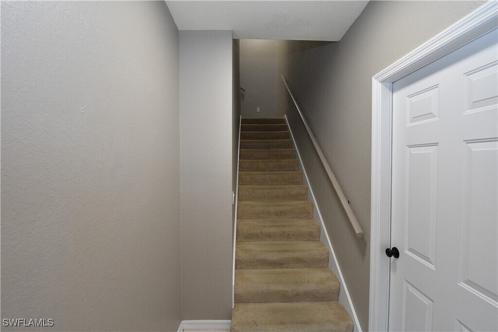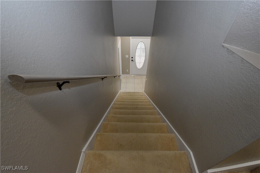 Spacious,second floor 3 bedrooms and two bathrooms wit a 2 car garage unit. Well kept unit with separated living area and dining area. Eat- in kitchen counter and plenty of wall cabinet storage. The guest bathroom has an additional laundry area. Two of the bedrooms are towards the front and the primary bedroom towards the rear of the property. Carpet flooring on the bedrooms,stairs and living room areas. Tile flooring at the kitchen,dining and bathrooms areas. There is a laundry area with a wash tub at the garage too. Screened balcony with exterior ceiling fan and lights. Beautiful place surrounded of well landscaped areas. Located near businesses,and SR82 road.