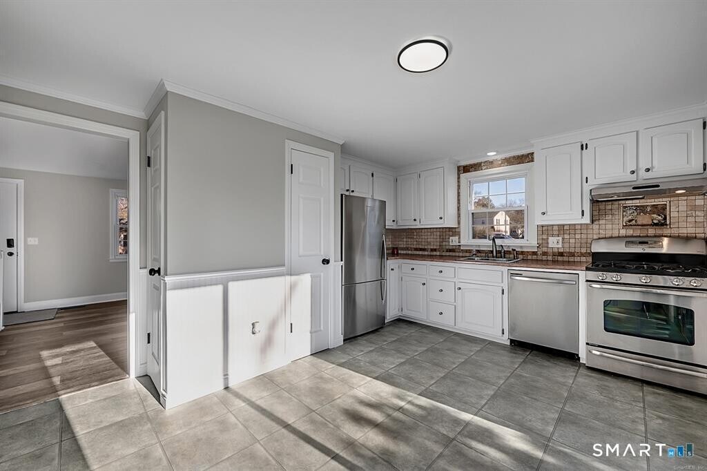 Call for Availability - Located in Glastonbury's Milestone Commons Complex, this beautiful unit features numerous upgrades and modern finishes. The open floor plan showcases vinyl flooring, neutral paint, and beadboard wainscoting that adds a refined decorative touch. The kitchen is equipped with stainless steel appliances, modern white cabinetry, and updated bathrooms throughout the home. A door off the kitchen opens to a large private patio, creating a seamless indoor-outdoor living experience. Upstairs, you'll find two spacious bedrooms and a full bath. Additional finished basement space provides comfortable extra living area, ideal for flexible use. Additional features include natural gas heating and central air. Conveniently located near Glastonbury Center with easy access to shopping, dining, and major highways. MLS# 24150860