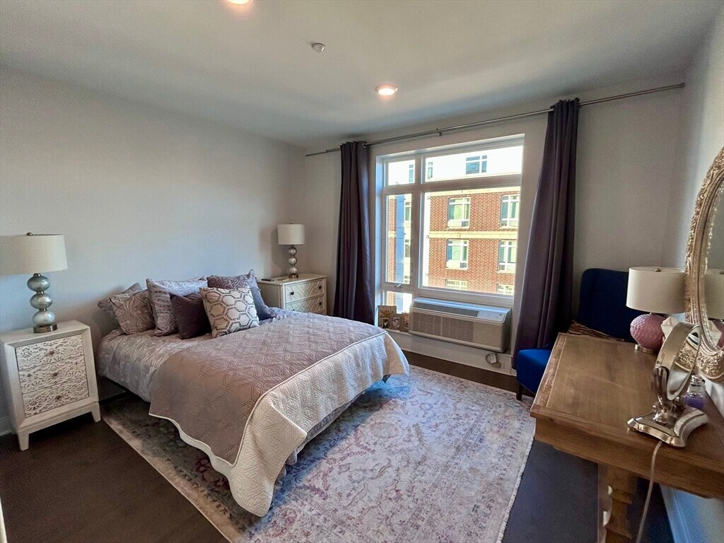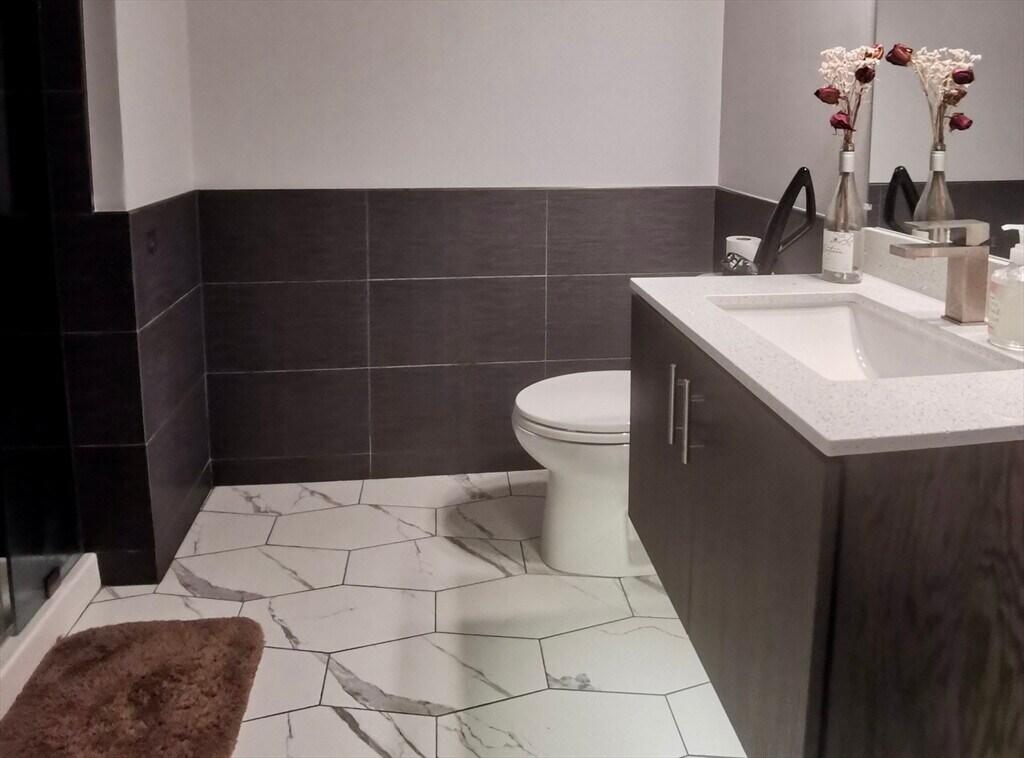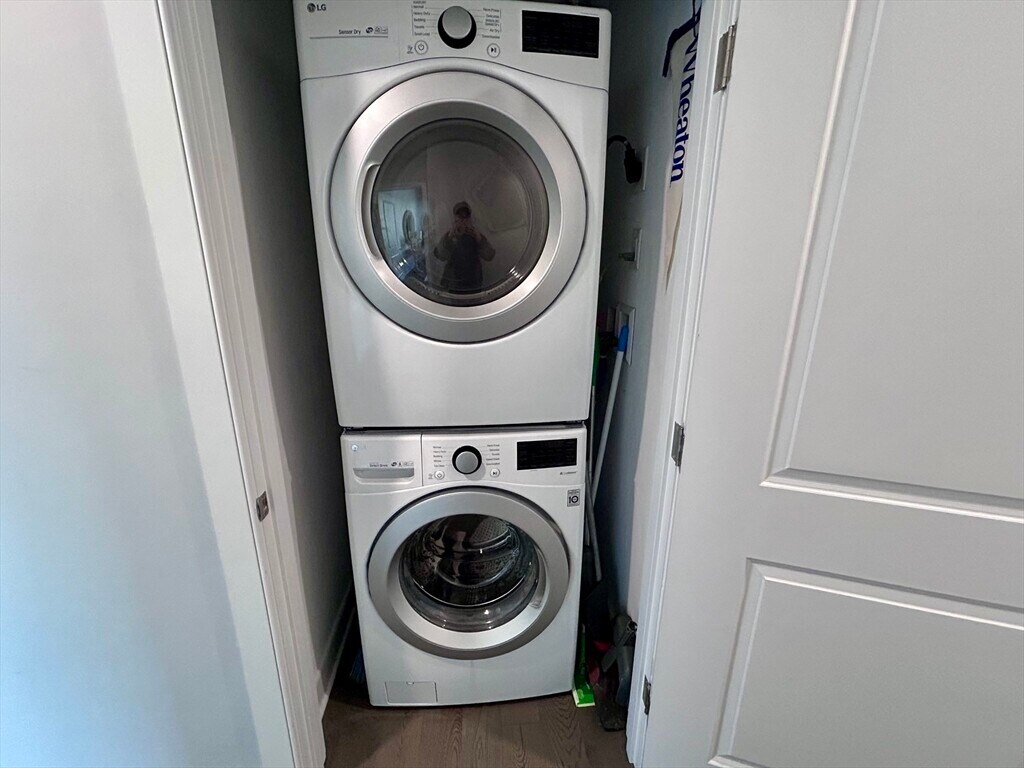 Available January 1,2026. Located in the heart of Quincy Center. This unit offers an exceptional opportunity to experience comfortable living in a desirable location. When enter the welcoming front door,on the right side is the modern style open kitchen with quartz counter tops and stainless steel appliances. Huge window with bright sunlights shining the living room in gray wash wooden laminated flooring through out the unit. 2 Bedrooms with very spacious and ample closet space; Master walk-in closet. 2 Bathrooms ( one have tiled showers,floating vanities and heated floors: Master has a double vanity and large tub. Washer and dryer in unit. 1 assigned parking space under car garage. A city living within walking distance to T station,many restaurants and shop. Very easy access to highway 93. MLS# 73460549
