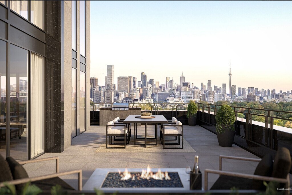 Welcome to Forest Hill private residences, new elegant boutique building in Forest Hill with a spectacular cn tower view. "The poplar plains suite", 1 bedroom plus den with two bathrooms, 834 square feet. Upgraded designer finishes, gas fireplace, gas line on balcony, chefs, kitchen with gourmet miele appliance private valet parking spot. Fantastic location close to transportation options are just moments from the site, having quick and easy access to the st clair streetcar, st clair station, and major highways. Surrounded by upscale private schools, boutiques, shops and restaurants and minutes from the best of the best that Toronto has to offer. Feature and amentites: exclusive porte cochere with valet parking, fully equipped gym, catering kitchen, tranquil pool with wet and dry saunas, garden oasis, private wine collection, 20 seated dining table, range of a la carte services.