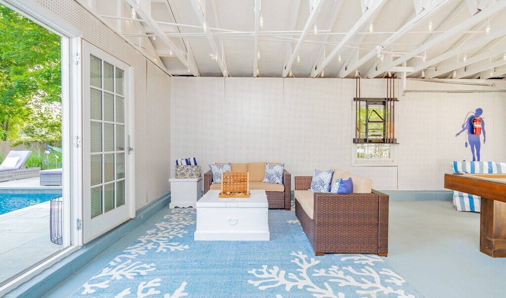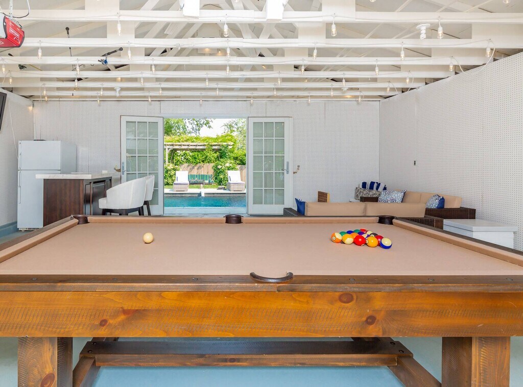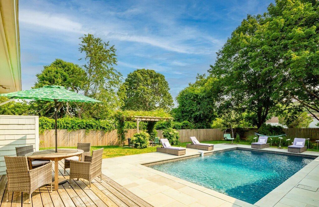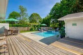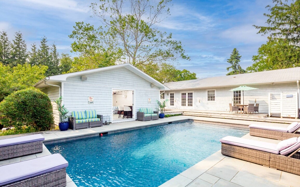Come and enjoy all Shelter Island has to offer. This lovely 3 bedroom home has been skillfully turned into the perfect summer spot with every amenity who could list! Gunite Pool, outdoor shower, covered seating area, pool house with bar, pool table and games area. Plenty of outdoor eating spaces, BBQ, herb garden, firepit, loungers and chilling spots including lovely front porch. Well stocked kitchen, open living area with fireplace and dining room, primary bedroom, guest with queen and a guest with bunk beds and 2 baths complete the first floor. Lower level has a movie area with projector. You may not leave the home but if you do there are numerous beaches to choose from, the Historic Heights stores, top class restaurants, nature preserve and ferries for adventures to Sag Harbor and Greenport! Rental Terms: June: $24,000