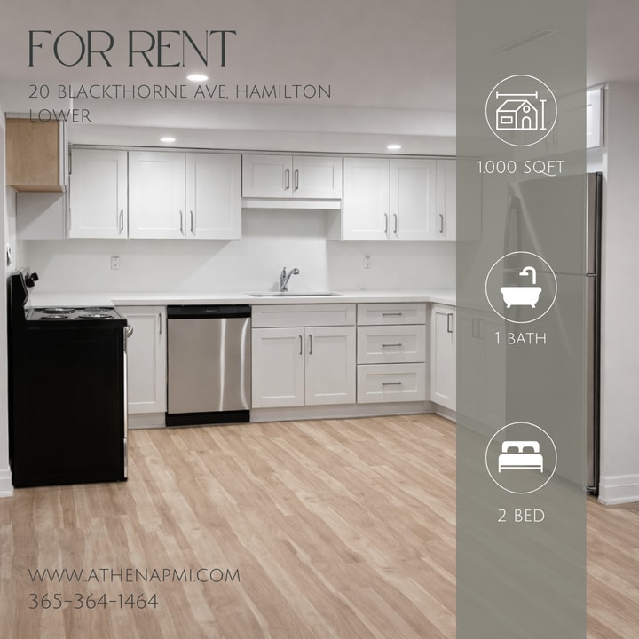20 Blackthorne Ave, Hamilton – Basement This 2-bedroom, 1-bathroom, approx 1000 sq ft basement apartment offers comfortable living in a quiet Hamilton neighbourhood. Features: 2 Bedrooms, 1 Bathroom Stainless Steel Fridge, Stove, Dishwasher Ensuite Laundry Central Air Street Parking Available Nearby Amenities: Close to grocery stores, restaurants, and everyday essentials Easy access to public transit and major roadways Located in a quiet residential neighbourhood in Hamilton Rent: $1,800/month + 40% Utilities Availability: May 1 Book a Viewing: Call us at Schedule Online: (Copy and paste to browser if needed) Virtual Video Tour Requests: