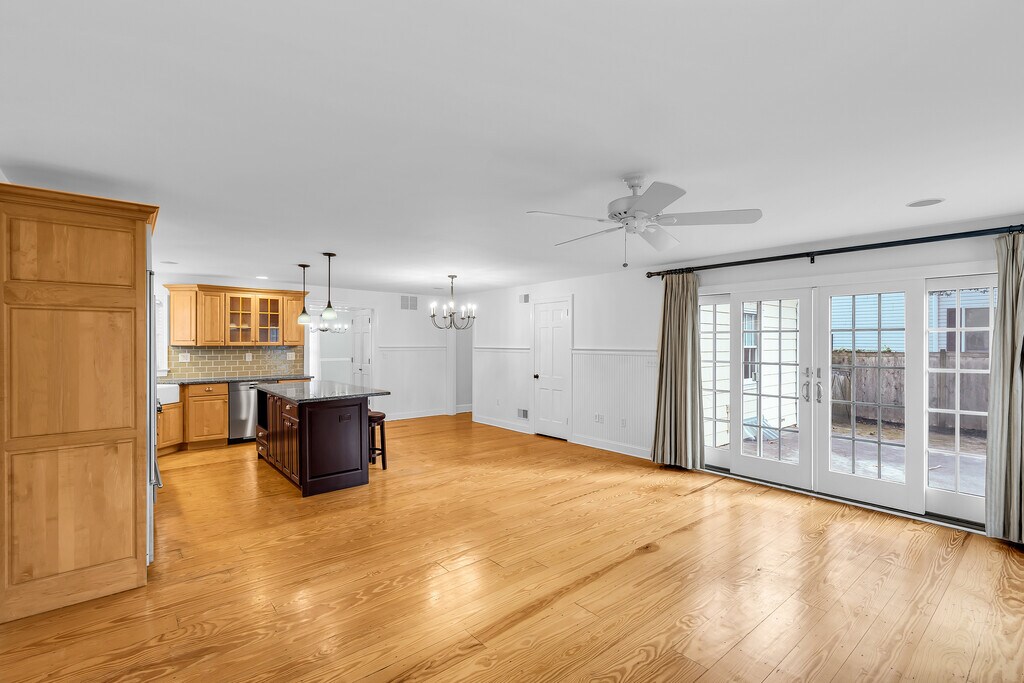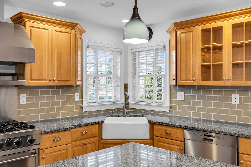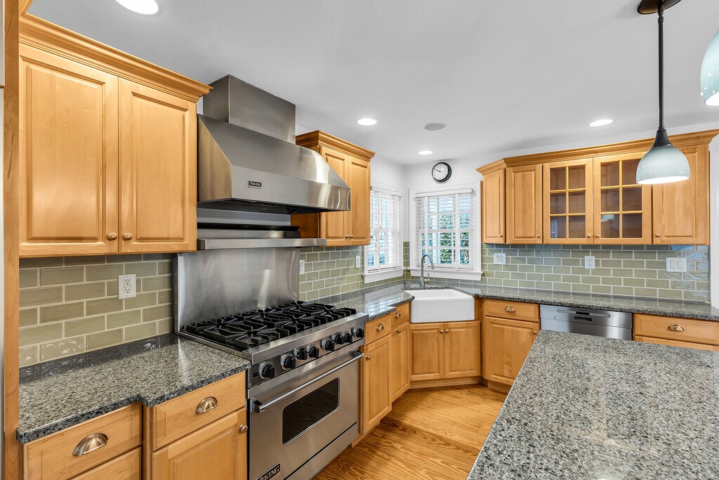 A beautifully maintained expanded cape in the heart of Rumson. The impressive kitchen features a Viking stove, large island, pantry closet, and granite countertops, opening to a family room with gas fireplace and sliders to a private fenced patio. Three bedrooms are upstairs, with a versatile first-floor bedroom ideal for an office or den. All bathrooms are newly remodeled. The cathedral-ceiling primary suite offers wood beams, a walk-in closet, and a new full bath. A 14KW generator provides peace of mind. Finished basement and oversized two-car garage with direct entry complete this exceptional home. Patio overlooks private fenced rear yard. Sq footage from tax records. All room sizes are approximate.