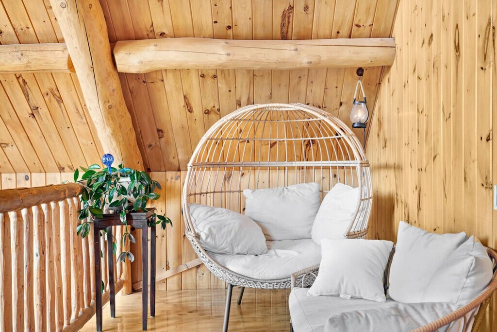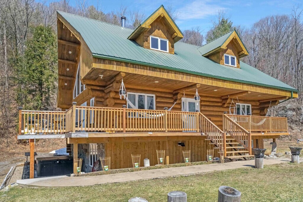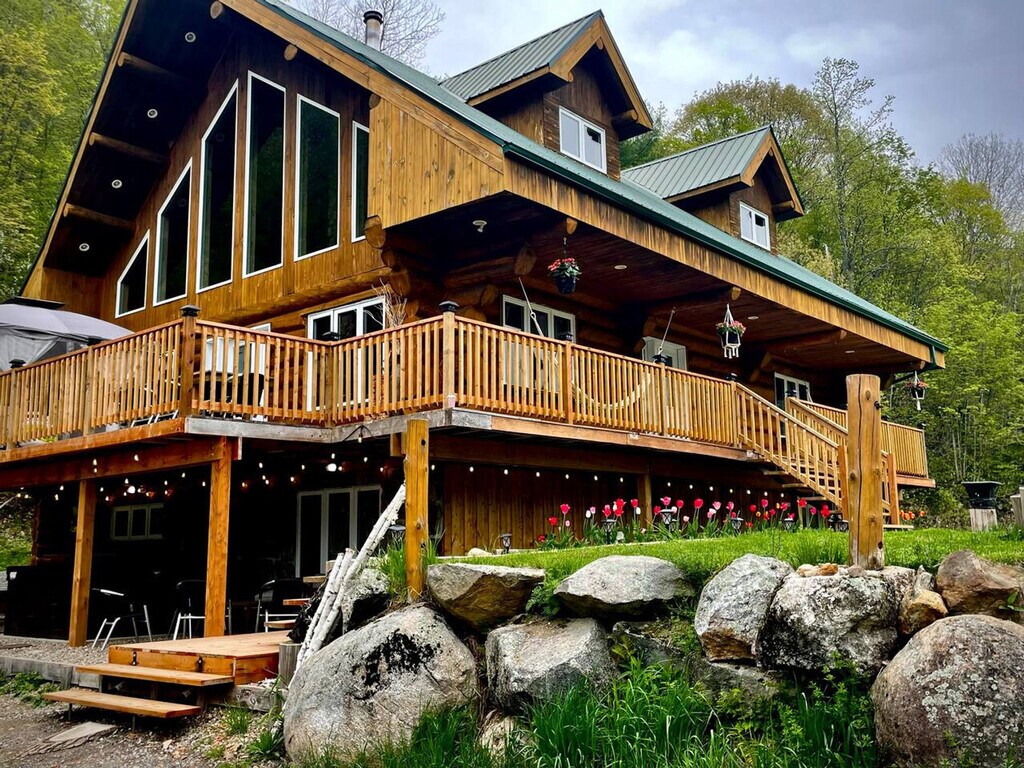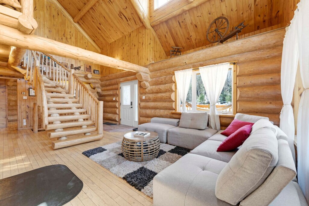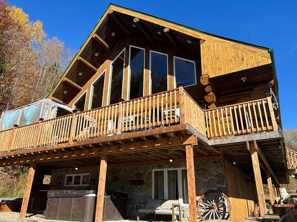 Escape to this charming log chalet on a peaceful 11-acre farm, just 4 minutes from Lac McGregor. Feel at home in this cozy retreat offering rustic charm and modern comfort. This chalet features large sunlit windows, a fireplace, and an expansive deck with stunning valley views. Unwind in the hot tub, sip coffee in a hammock, and watch the kids enjoy the sandpit. The first level has direct access to the hot tub and lounge area, a complete bathroom, a spacious bedroom, and a large living area. The main level boasts a stone fireplace and unique wooden details, two bedrooms, a complete kitchen, a full bathroom, and a bright living and dining room. Step onto the expansive wrap-around porch for coffee, conversations, and stunning views of nature. Ascend to the loft/lounge area on the upper level for relaxation, meditation, yoga, or to just hang out. The master bedroom awaits with its private balcony, hot tub, and full bathroom. Rental includes 2 inflatable paddle boards. Pontoon boat rental is available for an extra cost. Transportation to and from points of interest such as Wakefield, Nordik spa, downtown Ottawa, or Gatineau can be arranged upon request. This property is a very short drive to Plage Pelissier (municipal boat launch) where you can access Lac McGregor. Explore Lac McGregor just a short 4-minute drive away. No shoes are allowed in the house. No unregistered guests or parties are allowed. Smoking is prohibited. [SI]