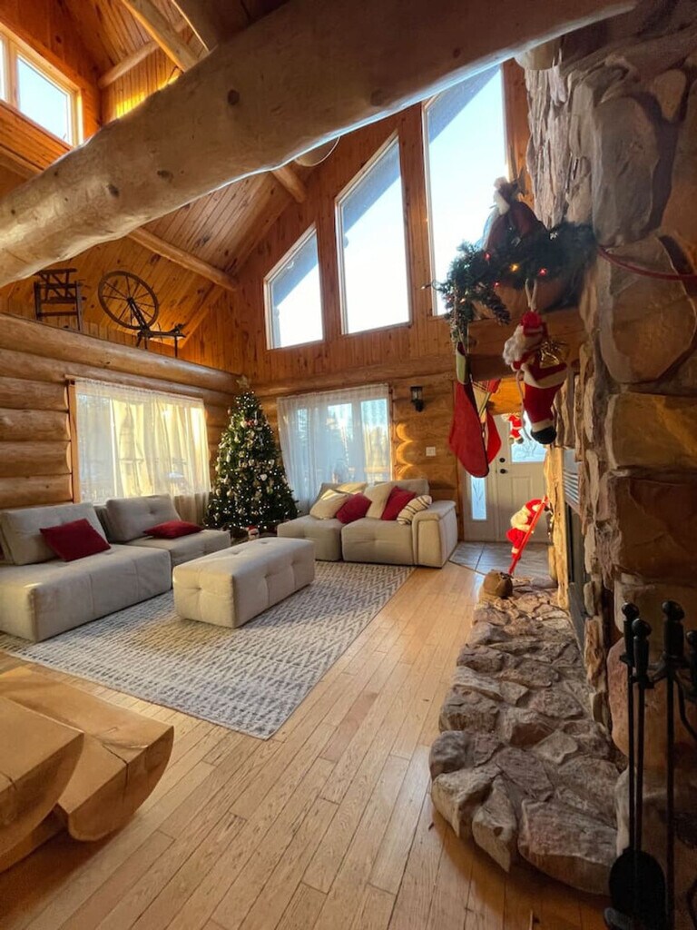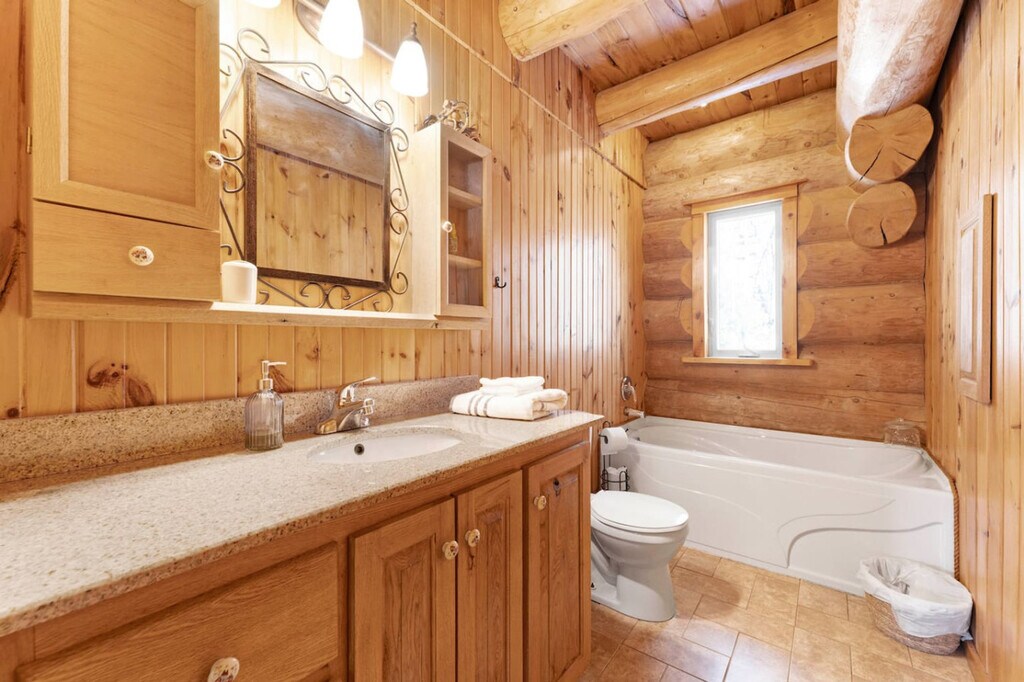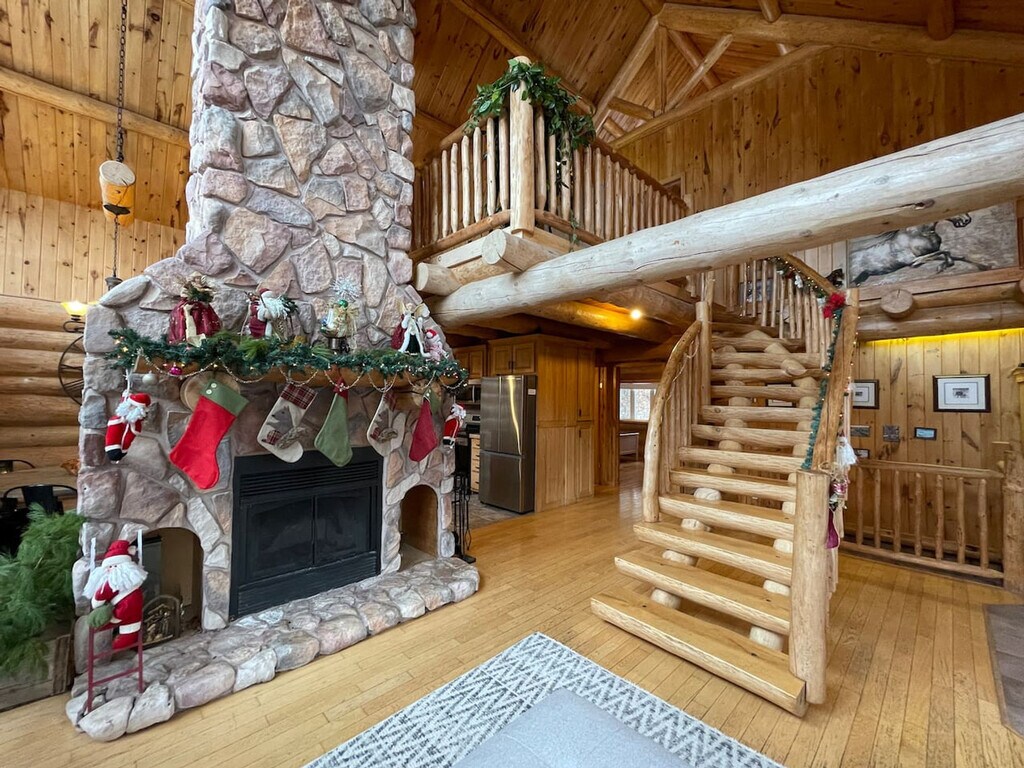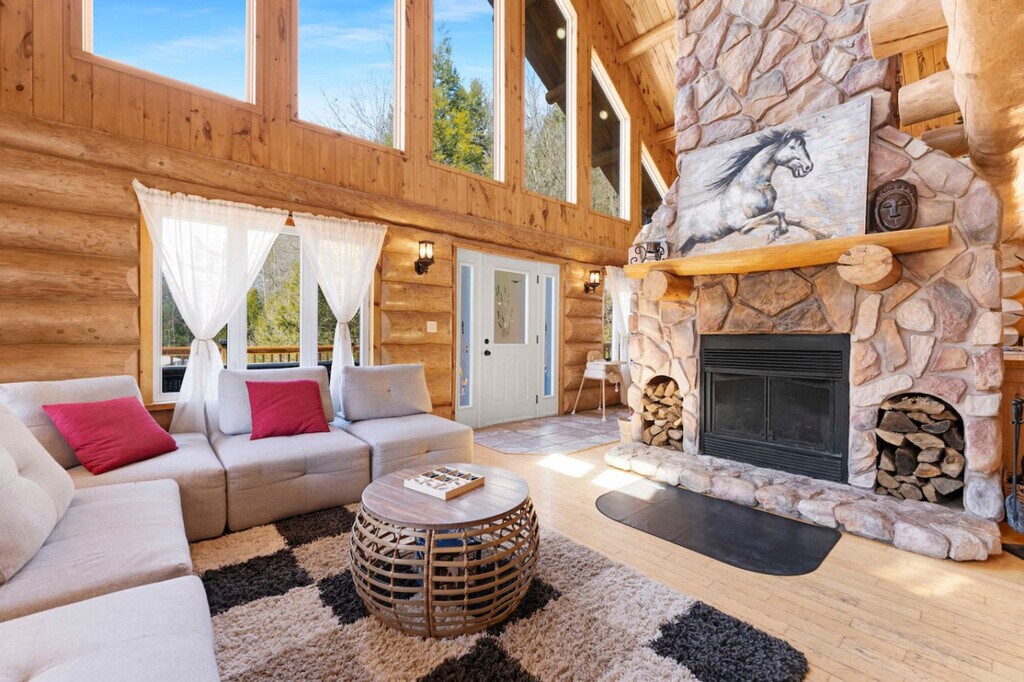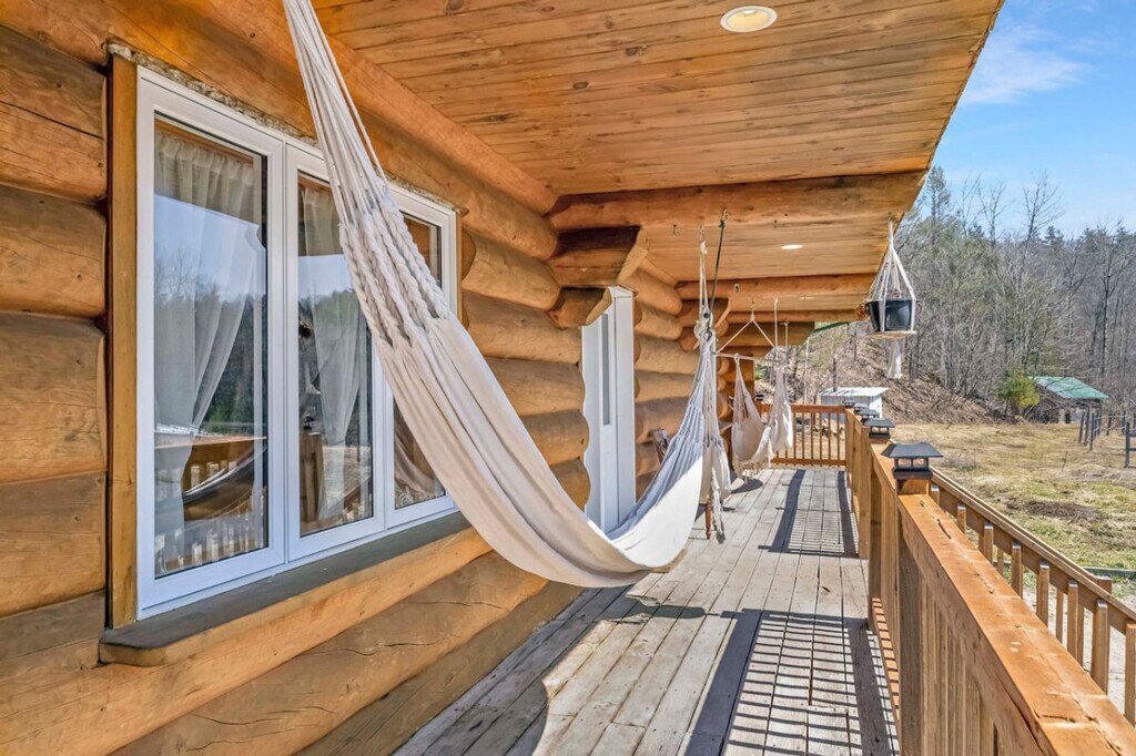 Escape to this charming log chalet on a peaceful 11-acre farm, just 4 minutes from Lac McGregor. Feel at home in this cozy retreat offering rustic charm and modern comfort. This chalet features large sunlit windows, a fireplace, and an expansive deck with stunning valley views. Unwind in the hot tub, sip coffee in a hammock, and watch the kids enjoy the sandpit. The first level has direct access to the hot tub and lounge area, a complete bathroom, a spacious bedroom, and a large living area. The main level boasts a stone fireplace and unique wooden details, two bedrooms, a complete kitchen, a full bathroom, and a bright living and dining room. Step onto the expansive wrap-around porch for coffee, conversations, and stunning views of nature. Ascend to the loft/lounge area on the upper level for relaxation, meditation, yoga, or to just hang out. The master bedroom awaits with its private balcony, hot tub, and full bathroom. Rental includes 2 inflatable paddle boards. Pontoon boat rental is available for an extra cost. Transportation to and from points of interest such as Wakefield, Nordik spa, downtown Ottawa, or Gatineau can be arranged upon request. This property is a very short drive to Plage Pelissier (municipal boat launch) where you can access Lac McGregor. Explore Lac McGregor just a short 4-minute drive away. No shoes are allowed in the house. No unregistered guests or parties are allowed. Smoking is prohibited. [SI]