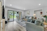 Welcome to your dream retreat in Hunters Run Country Club! This beautifully remodeled 2-bedroom, 2-bathroom first-floor condo offers a bright, open floor plan with picturesque golf course views. The modern white kitchen features a waterfall-edge island and sleek finishes, setting the tone for elegance throughout. Enjoy spa-inspired bathrooms, wood-look flooring, and a double-door entry to the primary suite for an added touch of sophistication. The glass-enclosed lanai opens to a private patio, the perfect spot to unwind and take in the serene scenery. Peace of mind comes with full hurricane-impact windows and sliders. Nestled within the amenity-rich Hunters Run Country Club, residents enjoy an active, social lifestyle with three golf courses, 18 tennis courts, 12 pickleball courts,
