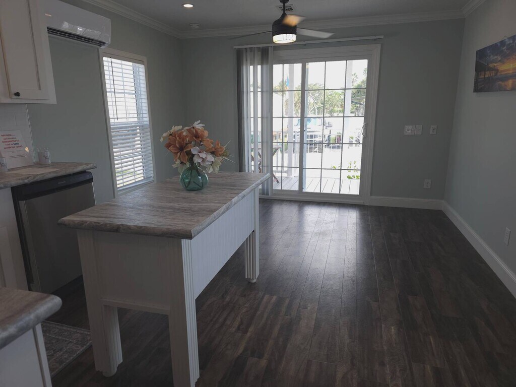 FOR RENT in River Palms 55+ Land-Leased Waterfront Manufactured Home Community Site-A 18 -All new stainless steel appliances: dishwasher, fridge, microwave, glass top stove -Hookups for stacked laundry appliances -Does not include furnishings or utilities -Must pass background checks for residency approval, $35 application fee per applicant -Available now for $1,700/month, one-year lease, $1,700 security deposit. -Sorry, no pets -Lots of amenities! Clubhouse, private beach, recreation area with gazebo, fire pit, BBQ, fishing pier, marina, Friday Happy Hour, games, Potluck dinners, Walking Club, Kayak Club, and more.