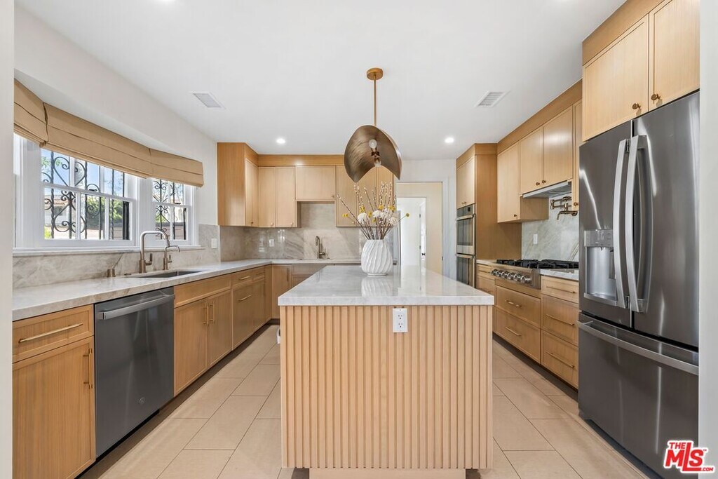 Newly renovated & filled with natural light, this stunning residence blends timeless character with modern luxury in one of LA's most desirable neighborhoods. Beautiful hardwood floors flow throughout, complemented by large windows, updated designer fixtures, graceful archways, & built-ins throughout. The dramatic living room features soaring ceilings, a statement chandelier, & a striking decorative fireplace. The upgraded kitchen showcases warm wood cabinetry, quartz counters, a generous center island, dual sinks, double ovens, a luxe Thor gas range, (all brand-new appliances) & a walk-in pantry. There's a breakfast room just off the kitchen plus a spacious formal dining room ideal for everyday living & entertaining. The home offers 4 BD, 3 featuring custom closets & en-suite baths, the 4th bedroom could also be used as a den. The primary suite is a true retreat with built-in closets & a spa-inspired black & white marble-clad bath with dual sinks plus a separate tub & shower. A hallway powder room, outdoor living area, & detached 2-car garage complete the property. Exceptional central location moments from La Brea Blvd's standout restaurants & shops, with convenient access to The Grove, the Original Farmers Market, & Pan Pacific Park. MLS# 26639225