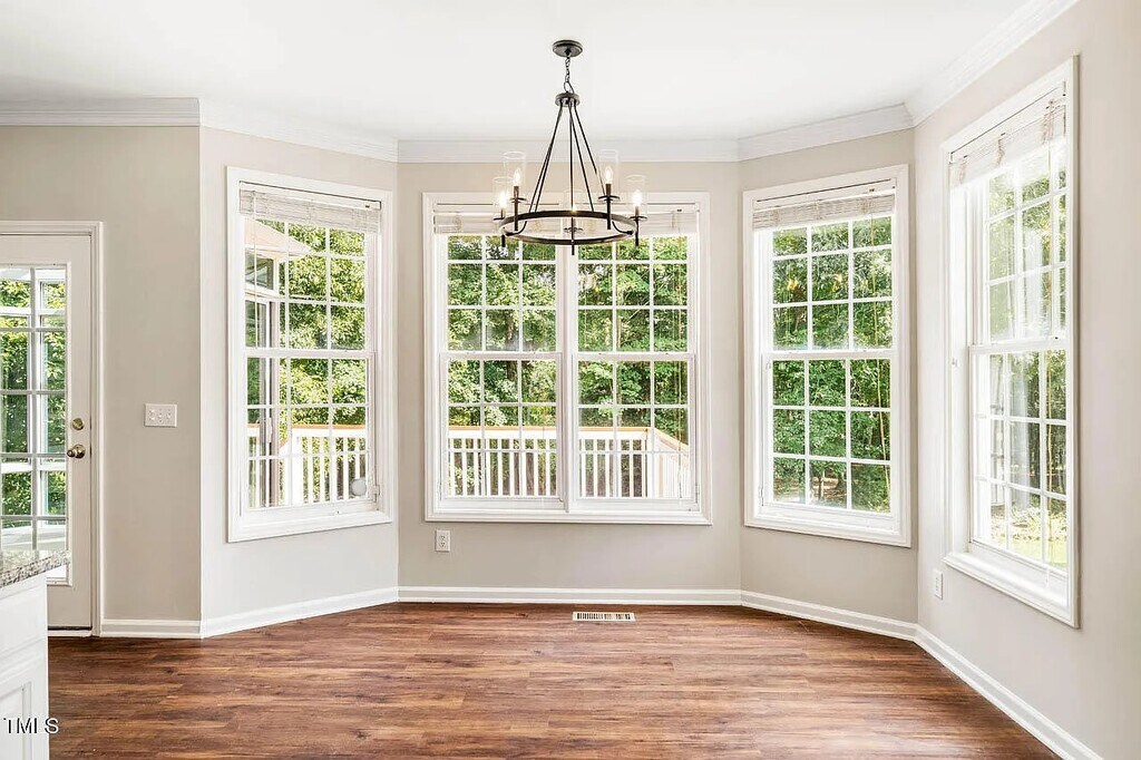 Located in the vibrant center of Chapel Hill, this charming home offers the tranquility of a convenient setting. This remarkable 5-bedroom, 2.5-bath residence seamlessly combines comfort with elegance. As you enter, you're welcomed by soaring ceilings, detailed moldings, and premium vinyl floors, creating a warm environment perfect for both social gatherings and everyday life. The open design includes a snug living area with a gas fireplace, a formal dining room, a sunlit eat-in kitchen with granite surfaces, and a captivating glass solarium that leads to a spacious backyard deck with scenic wooded views. The attached 2-car garage ensures ease of access. Upstairs, the bedrooms are enhanced by plush carpeting, with the primary suite featuring a private bathroom for added seclusion. A flexible bonus room offers additional space for a gym, hobbies, or an extra bedroom. Recent updates include fresh interior paint, 2020 roof, 2021 full replumb of the entire house, 2023 Trane downstairs gas pack and upstairs heat pump, new washing machine and refrigerator (both included), and a hot water heater (2025), ensuring peace of mind. Ideally situated just minutes from downtown Chapel Hill and top-rated schools, this property offers a unique blend of location, sophistication, and comfort.
