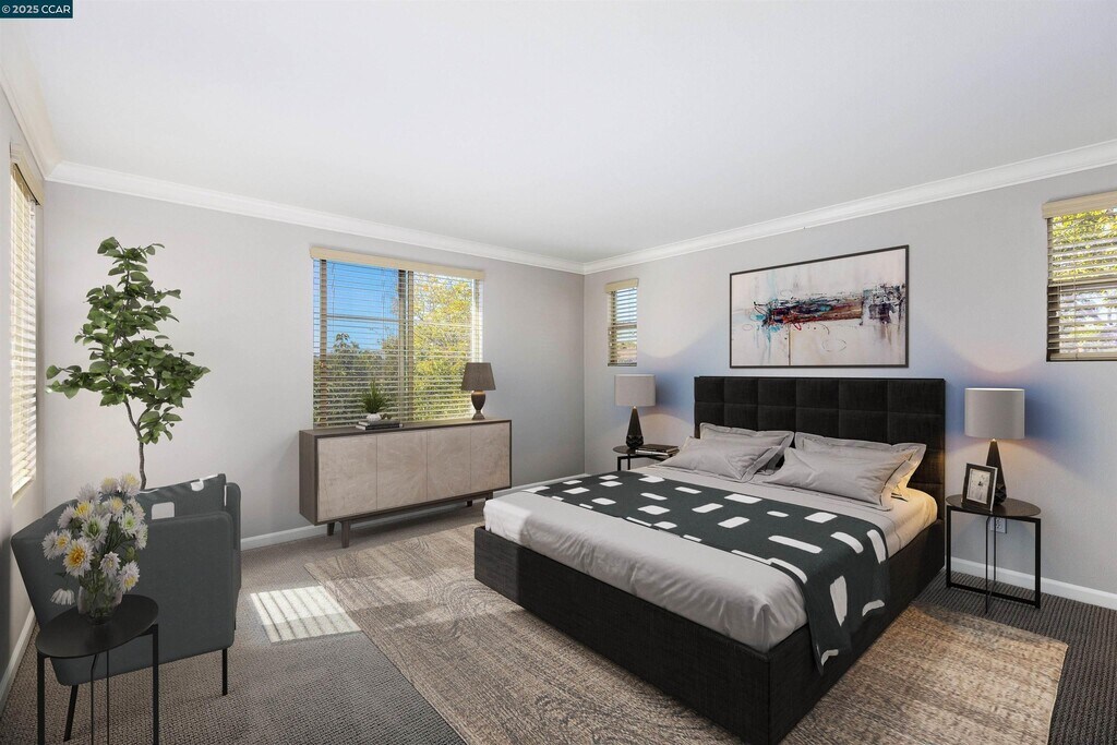 Fresh,light,bright,newly updated/upgraded everything...kitchen,stainless appliances,bathrooms,light fixtures,window coverings and custom paint. New flooring and carpet. Public transportation. 1 block to shopping and restaurants. Top rated schools K - 12,plus college. Near pool/clubhouse. Large private patio. No adjacent neighbor. Oversized 2 car garage with direct interior access and custom storage. Spacious primary suite with walk-in closet,large bathroom with walk-in shower. Laundry area w/ utility cabinets. Prime location w/ easy access to Hwy 580/680,and hiking trails & parks. Apply with RentSpree