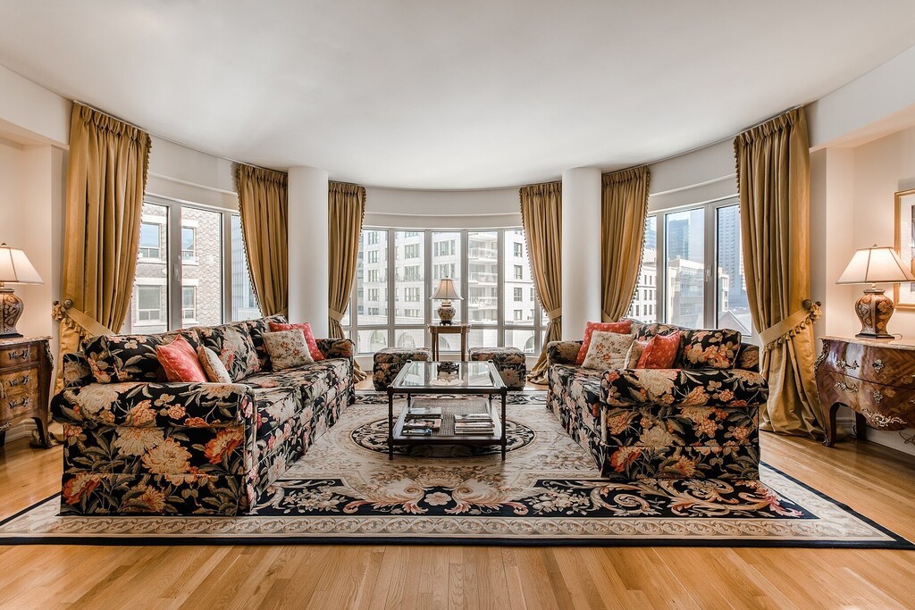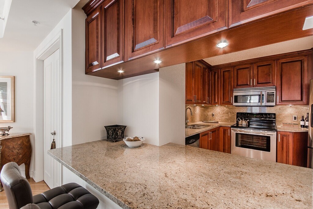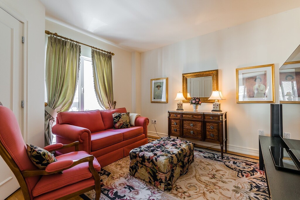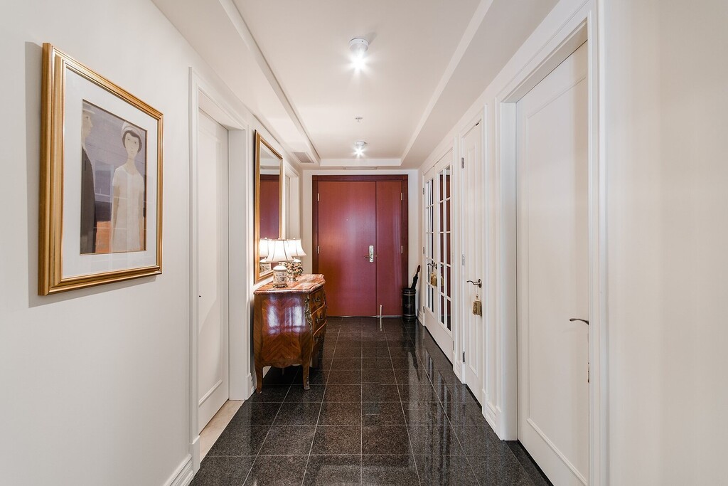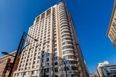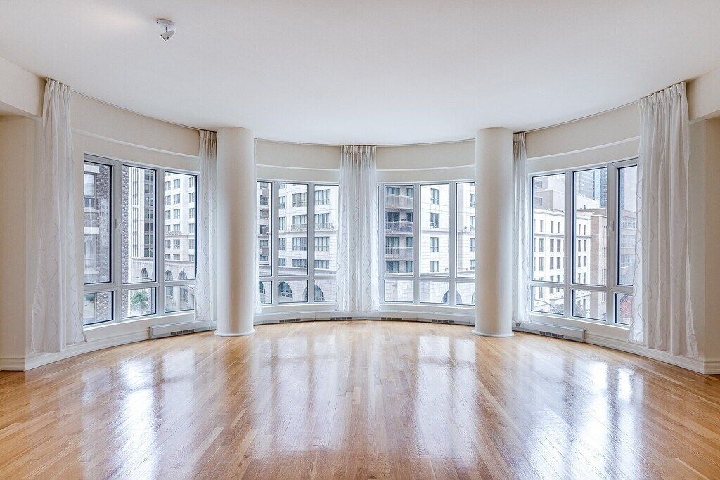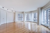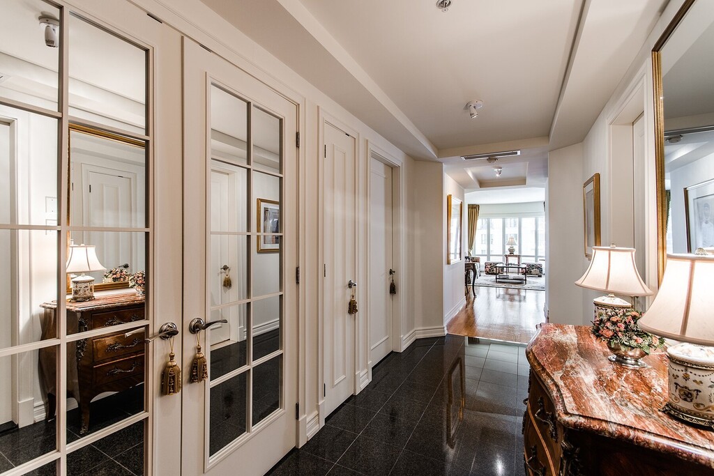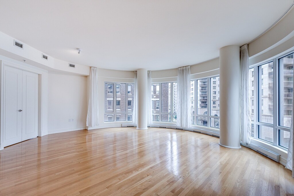 Luxury 2-bedroom residence with view in the prestigious 'ROC FLEURI', in the Golden Square Mile of downtown. This stunning unit, with its beautiful semi-circular window, is flooded with light. Quality finishes combined with a spacious layout, excellent amenities and ideal location, are sure to please even the most discerning resident. Note: The A/C compressor in the apartment was recently replaced. Features of the building: 24/7 doorman, Valet, Indoor pool, fabulous outdoor lounge area, gym with spa-like changing room, reception hall, Garage & Locker included. Well managed complex in great central location. Immediate occupancy!