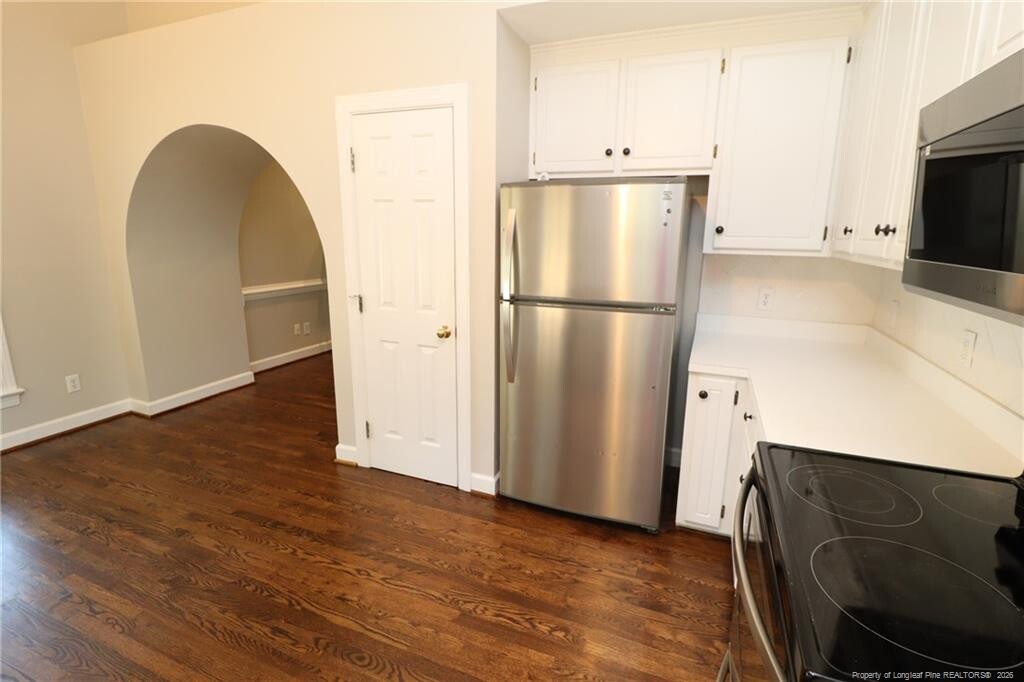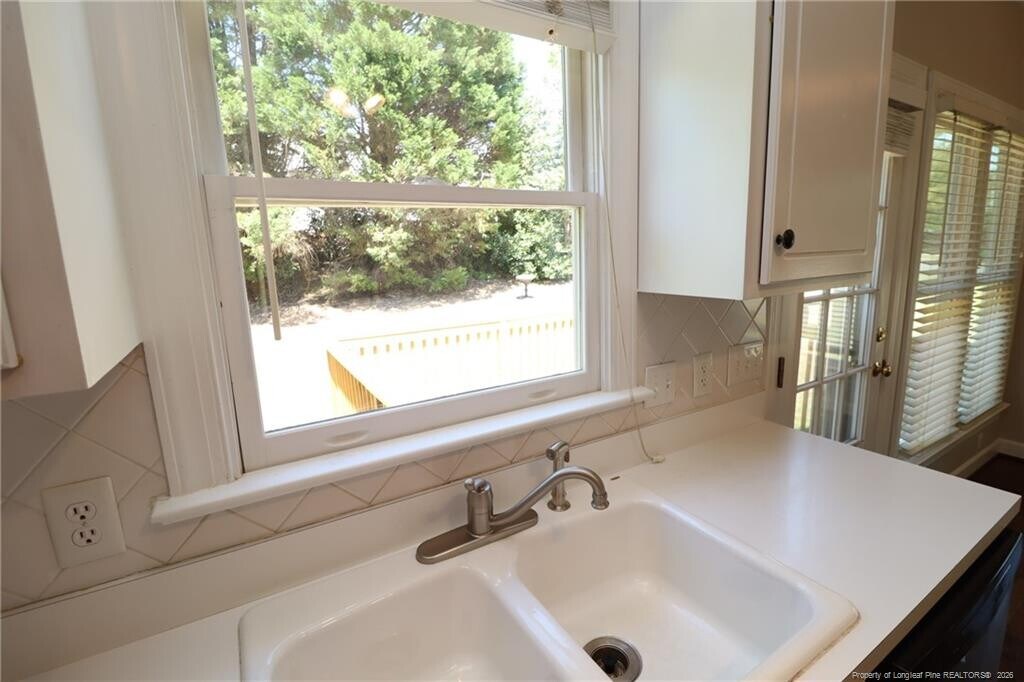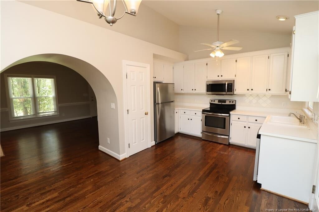 This charming ranch-style home is available immediately and nestled in Apex's Charleston Village! 2002 Keokuk is just minutes away from downtown Apex, NC-55/I-540, Beaver Creek Commons, local parks and greenways, schools, and much more! A paved driveway and covered front porch welcome you home. Once inside, you are greeted with abundant natural lighting, vaulted ceilings, real hardwood flooring, and spacious living areas. The family room showcases a double picture window, ceiling fan, chair rail, a plant shelf, and accent lighting that highlights the fireplace. An arched entry invites you into the combined kitchen and dining area. The kitchen features bright white cabinetry, a pantry, acres of countertops, a custom tiled backsplash, a ceiling fan and recessed lighting above the enameled, double-bowl sink with a picture window offering a lovely backyard view. This kitchen also includes a stainless-steel appliance package with a built-in microwave, a refrigerator, and a smooth-top electric oven. An adjacent dining area includes a custom chandelier, 4 picture windows, and direct access to the back deck and yard; creating an indoor-outdoor living experience. Tucked away on the other side of the home are the three bedrooms and two bathrooms, as well as a conveniently located laundry center in the hallway. The primary bedroom offers a vaulted ceiling with a ceiling fan, dual picture windows that provide natural light, a spacious walk-in closet and en-suite bathroom with dual sinks atop an elongated vanity, tiled flooring, and a separate shower/tub and water closet room. Bedrooms #2 and #3 are both generously proportioned with ample closet space and easy access to a full hall bathroom with a vanity and shower/tub. Before wrapping-up your tour, be sure to visit the amazing backyard with an elevated deck that overlooks the backyard and a wooded buffer for additional privacy.