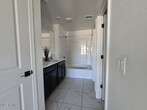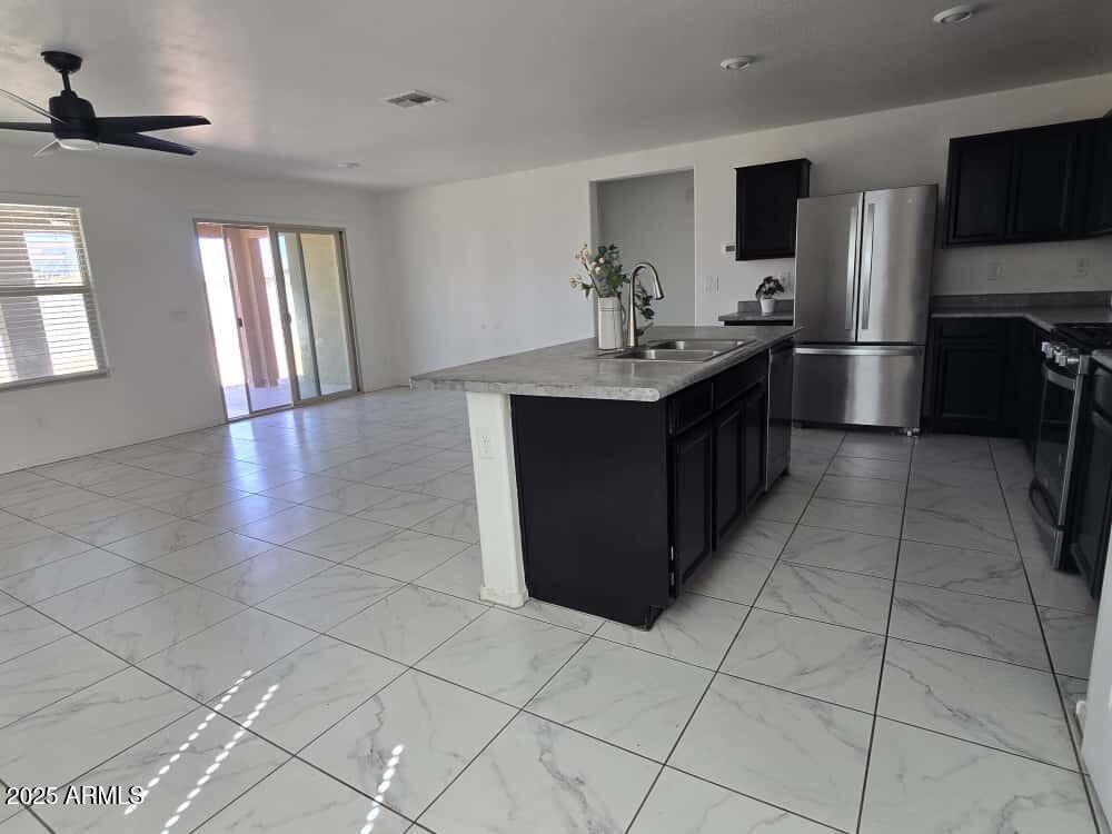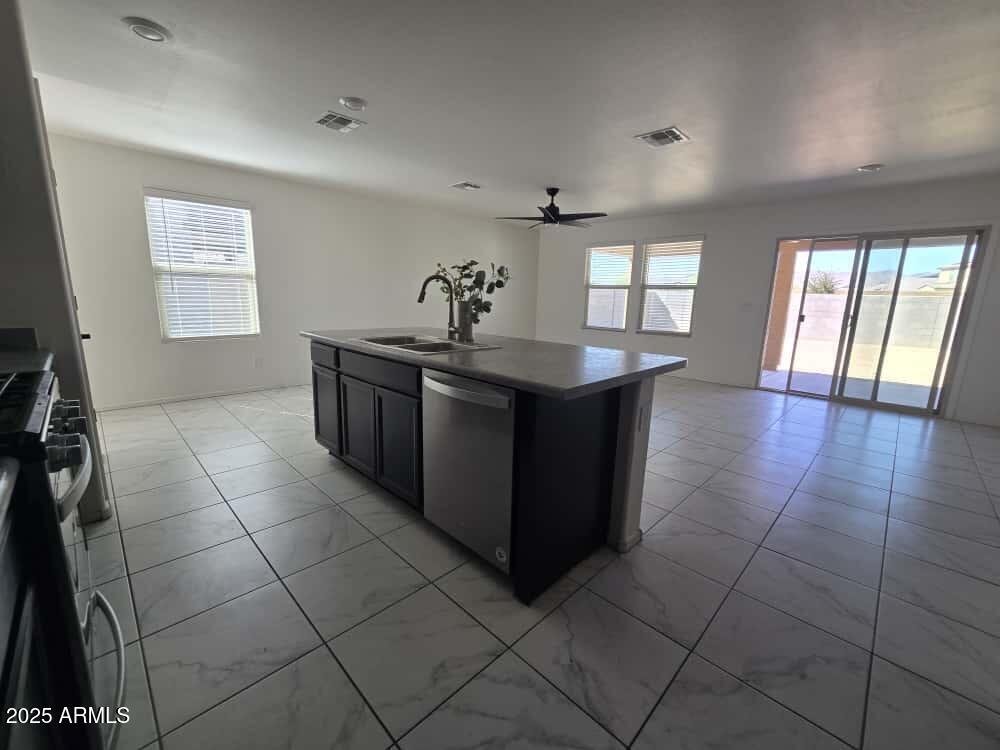 ADORABLE Newer Build in Blue Horizon Community! Beautifully maintained with tile and carpet throughout,this home offers a bright and open living space with ceiling fans and upgraded lighting. The kitchen boasts ample cabinetry,an island,gas range,breakfast bar,and dining area. Enjoy a split floor plan featuring a spacious primary suite with dual sinks and a walk-in closet. The large backyard includes a covered patio and block fencingperfect for relaxing or entertaining. Benefit from North/South exposure for added energy efficiency. Conveniently located near schools,shopping,dining,and freeways. Washer,dryer,and fridge included. Don't miss outthis charming home is ready for you!
