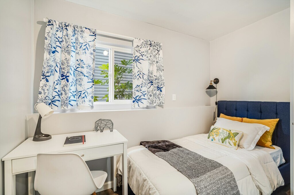 This peaceful, spotless 2BD/1BA with laundry washer and dryer in the highly walkable Fruitvale/Harrington neighborhood (92 walk score) comes FULLY FURNISHED with all the necessary amenities to enjoy your stay. Constructed in 2019, this high performance, energy efficient home has an open floor plan that maximizes space and flow. This is an attached, garden-level floor unit with a private entrance. Professionally designed with luxurious furniture and stainless-steel appliances. Luxury vinyl plank flooring provides a resilient walking surface. The living area has a wall-mounted flat screen LED Smart TV. The sofa also converts to a bed, when needed. The kitchen features quartz countertops, a full-sized electric flat-top stove/oven, garbage disposal microwave, toaster, and electric kettle. Stylish writing desks in each bedroom provide a productive work environment. The entire unit has its own dedicated fiber-wire internet connection and wifi hubs for uninterrupted video conferencing. Upholstered platform beds, one full-sized and one twin and a dimmable reading light beckon you to rest and unwind after a long day at work. Both bedrooms have a closet organizer system with a set of three dresser drawers. This central East Bay location in a friendly neighborhood is the perfect starting point for trips up north to Napa/Sonoma, west to San Francisco, east to Yosemite, and south to Silicon Valley. A 5 minute walk to Mi Ranchito Market, a family-owned grocery store with amazing, affordable produce. 7-minute walk to Walgreens. Less than 1 mile to the Fruitvale BART station (15-20 min walk). There is also a bus stop just down the street, served by AC Transit #40. Easy access to 580 and 880 highways.