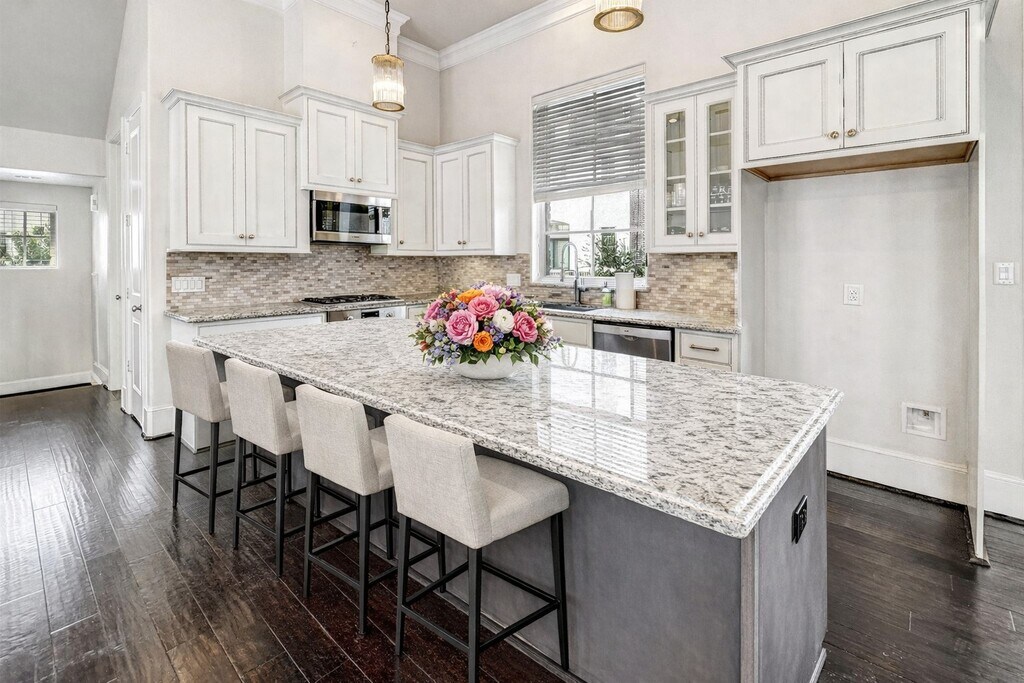 The first floor features a private bedroom with full bath and welcoming entry ideal for guests or a home office. The second floor is designed for entertaining,with an open-concept kitchen,dining,and family room,a convenient half bath,and direct access to a balcony for indoor/outdoor living. The third floor serves as a true primary retreat,featuring an oversized suite,spa-style bathroom,walk-in closet,dedicated laundry,and a versatile flex space perfect for a sitting area,office,or home gym. The fourth floor offers a third bedroom,full bath,and a spacious game room that opens to a covered rooftop deck. Upgrades include soft-close Shiloh cabinetry,Bosch stainless steel appliances with a gas cooktop,and modern energy-efficient features such as a tankless water heater and a four-zone A/C system. Community amenities include lakes,a resort-style pool,jogging trails,and open green space. Conveniently accessible to the Texas Medical Center and Downtown. MLS# 31177142