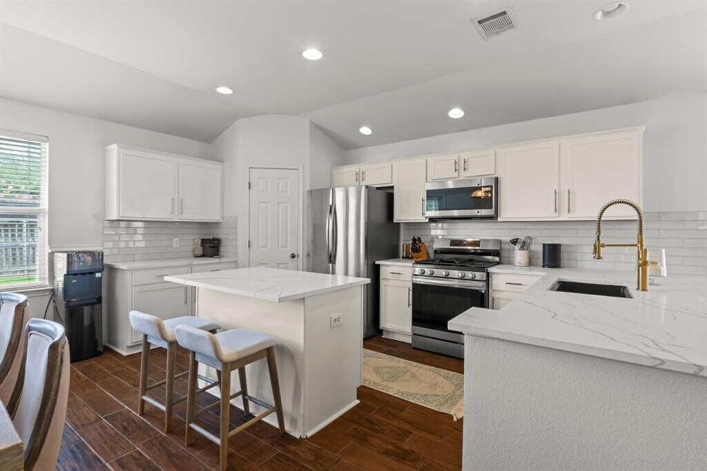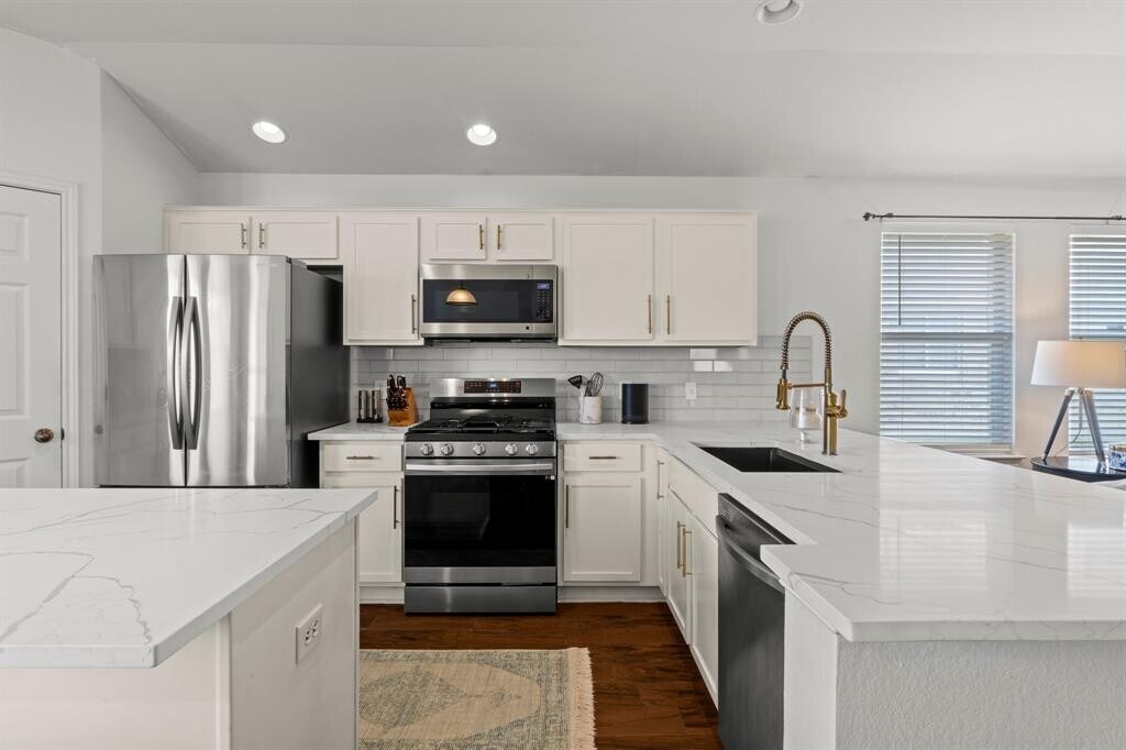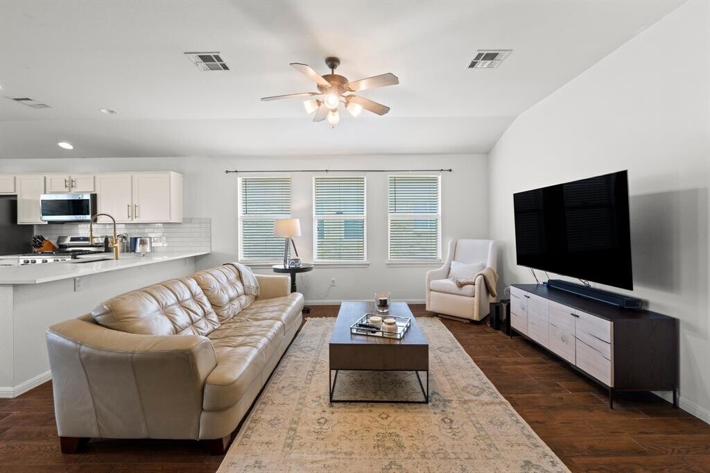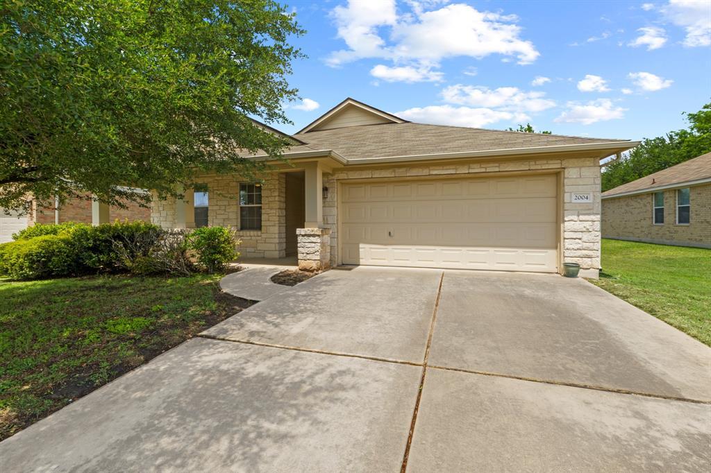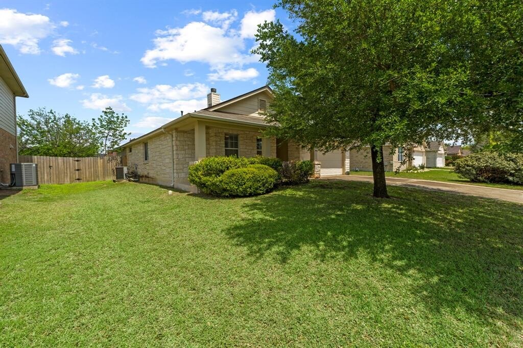 Welcome to this beautifully maintained single-story home offering the perfect blend of comfort, style, and functionality. From the charming covered front porch with stone accents to the bright, open-concept interior, this home is designed for easy everyday living and effortless entertaining. Step inside to soaring ceilings, rich wood-look tile flooring, and an abundance of natural light flowing through the spacious living and dining areas. The kitchen is a true centerpiece, featuring quartz countertops, stainless steel appliances, crisp white cabinetry, and an island with a sleek farmhouse-style sink—ideal for gathering and hosting. The primary suite offers a private retreat with generous space, dual vanities, a soaking tub, and a separate walk-in shower. Additional bedrooms provide flexibility for guests, a home office, or a growing household. Out back, enjoy a fully fenced yard with a patio perfect for grilling, relaxing, or entertaining under the Texas sky. Conveniently located with easy access to major roadways, shopping, and dining—this home checks all the boxes for comfortable living. Easy 20 minute drive to downtown Austin. MLS ID 6458642