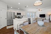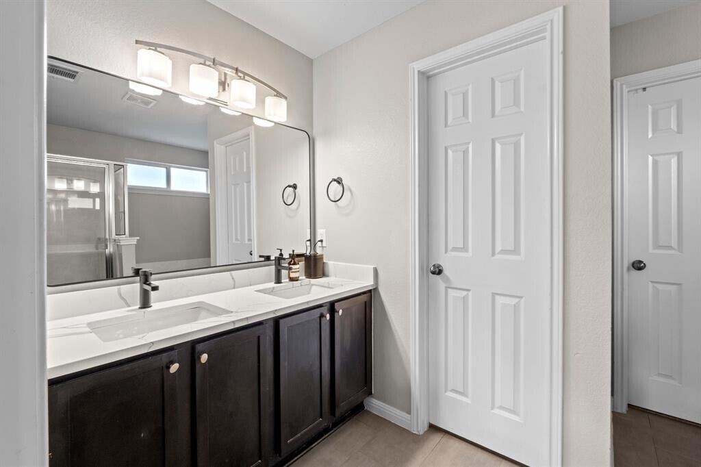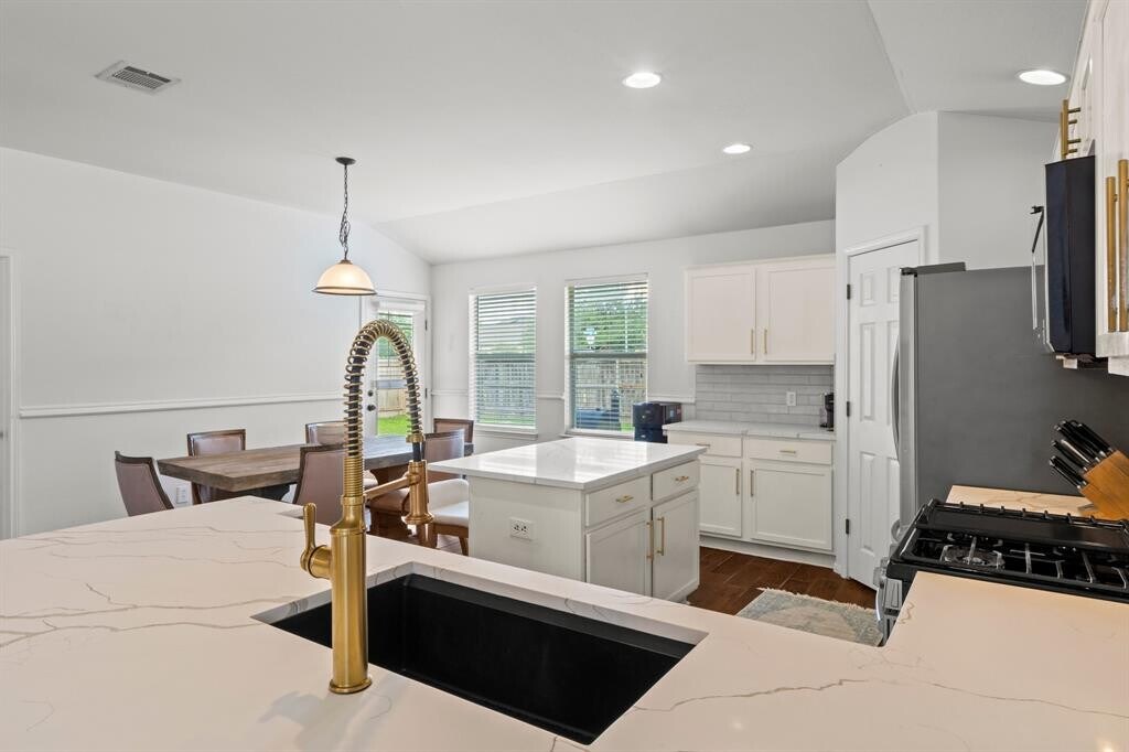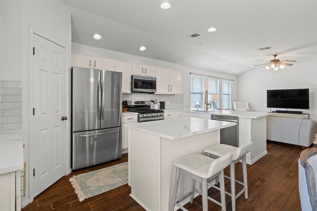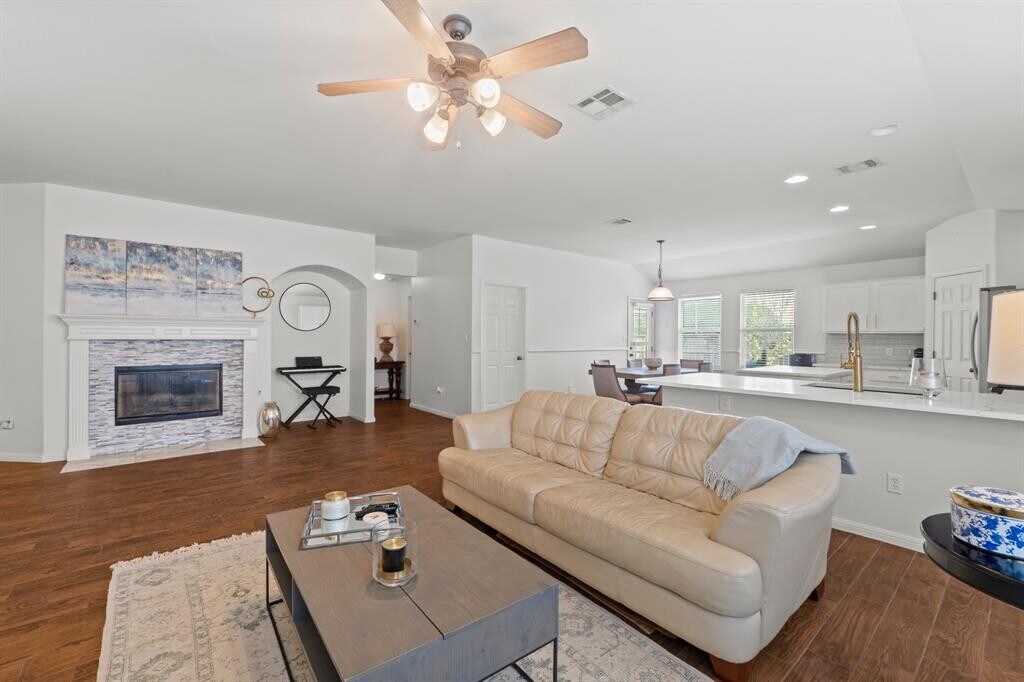 Welcome to this beautifully maintained single-story home offering the perfect blend of comfort, style, and functionality. From the charming covered front porch with stone accents to the bright, open-concept interior, this home is designed for easy everyday living and effortless entertaining. Step inside to soaring ceilings, rich wood-look tile flooring, and an abundance of natural light flowing through the spacious living and dining areas. The kitchen is a true centerpiece, featuring quartz countertops, stainless steel appliances, crisp white cabinetry, and an island with a sleek farmhouse-style sink—ideal for gathering and hosting. The primary suite offers a private retreat with generous space, dual vanities, a soaking tub, and a separate walk-in shower. Additional bedrooms provide flexibility for guests, a home office, or a growing household. Out back, enjoy a fully fenced yard with a patio perfect for grilling, relaxing, or entertaining under the Texas sky. Conveniently located with easy access to major roadways, shopping, and dining—this home checks all the boxes for comfortable living. Easy 20 minute drive to downtown Austin. MLS ID 6458642