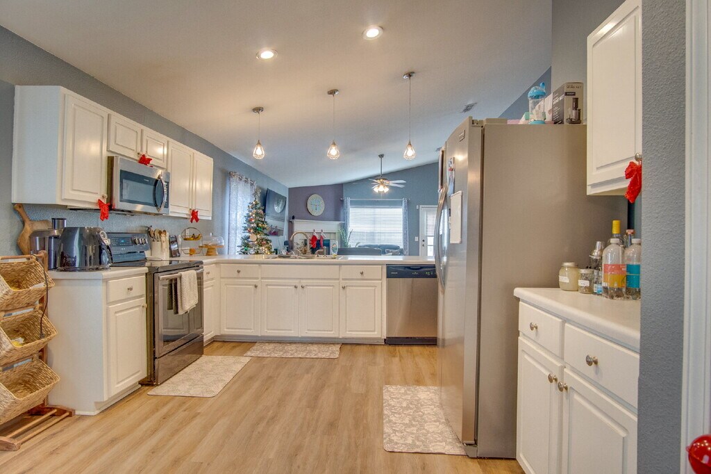 Move-in Special- $250 off the first month's rent. See this spacious 3-bedroom, 2-bathroom home for rent in the desirable Cottages at Marcus Lake subdivision, conveniently located less than 15 minutes from Downtown Pensacola, Cordova Mall, and the interstate, with Pensacola Beach just 30 minutes away. This home features an open floor plan with high ceilings in the main living and dining areas. The kitchen boasts white cabinetry, Samsung stainless steel appliances, a breakfast bar, a pantry, and an eat-in dining nook. Just off the kitchen is a second living area with vaulted ceilings, a fireplace, and abundant natural light. The primary bedroom features a large walk-in closet and a private en-suite bathroom with double vanities and a shower/tub combo. Two additional guest bedrooms share a centrally located hall bath. The fully fenced backyard features a concrete patio, ideal for relaxing or grilling. Additional amenities include a 2-car garage, a washer and dryer for convenience, and a gas water heater. Pets are allowed with owner approval; $250 non-refundable fee for the first pet and $150 non-refundable fee for any additional pets, no aggressive breeds. Residents are required to have renter liability insurance, which can be added for $11.95/month, or you may opt into the Resident Benefits Package (RBP) for $45/month, which includes renter liability insurance, HVAC air filter delivery, and on-demand pest control; more details are available in the application. Home is currently occupied. Please do not disturb the current residents. Coming available February 1st!