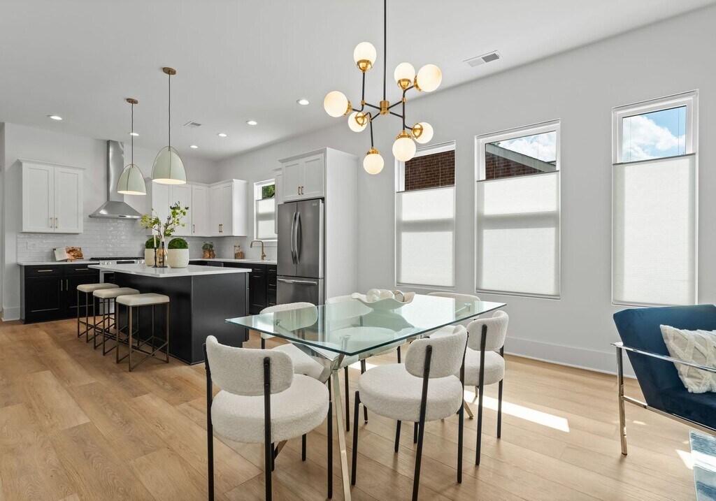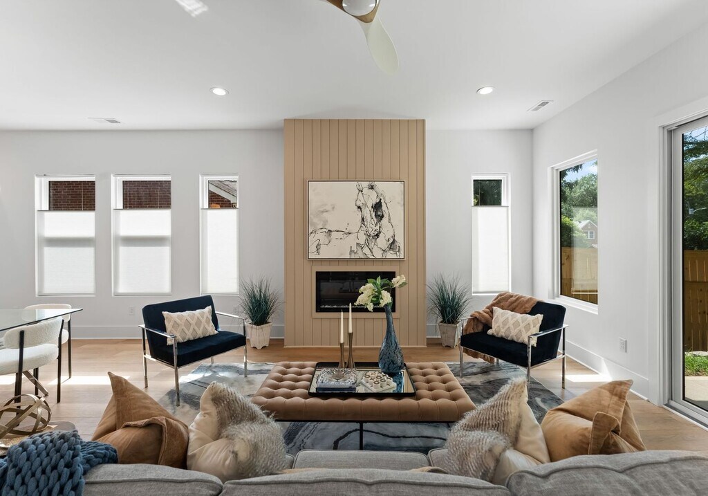 This 4-bedroom, 2.5-bath home blends high design with smart functionality just minutes from the heart of Uptown. Warm-toned floors, expansive windows, and soaring 10-foot ceilings create an airy, elevated feel throughout the open layout. A stunning quartz island anchors the kitchen, which features premium appliances and designer finishes, and flows seamlessly into the living area highlighted by a cozy shiplap-accented fireplace. Upstairs, you'll find the expansive primary suite, offering a spa-like bath with a soaking tub, floor-to-ceiling tiled walk-in shower, dual vanity, and a customized walk-in closet. Three additional bedrooms, a Jack-and-Jill bath, and a dedicated laundry room complete the upper level. Enjoy a fenced, private backyard perfect for hosting or unwinding. To view this home today, please contact QC Properties to schedule a showing.
