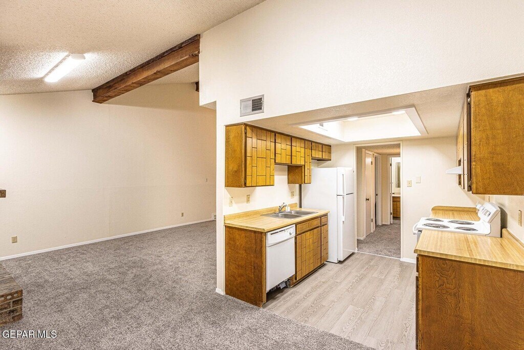 Charming East El Paso Rental! This quaint quadplex unit boasts vaulted ceilings and a cozy fireplace. The primary bedroom is conveniently located on the main floor for easy access. Enjoy a private,fenced backyard—perfect for relaxing or entertaining. Water and trash are included in rent. Don't miss out on this desirable location! No Pets