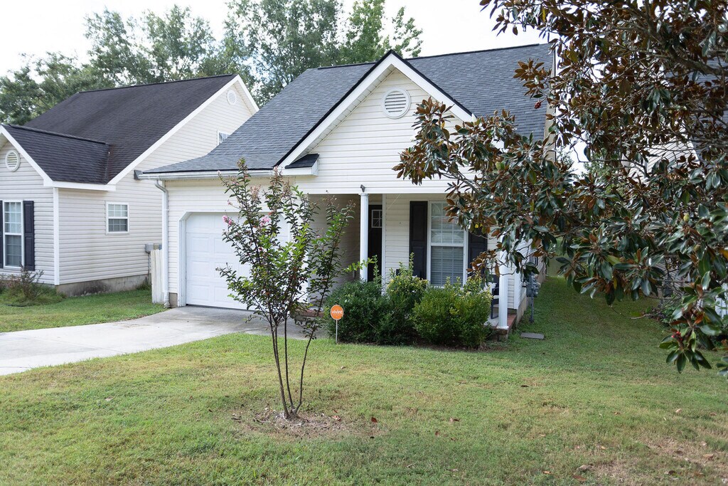 YOU''RE HOME - Enjoy mornings of the sunrise and evenings of sunset on your back deck overlooking the captivating view of the serene pond with walking trail from the backyard. Charming cottage with large great room,gas fireplace w/ tiled hearth. Dining area open to the great room area from the kitchen. Granite counters and beautifully tiled backsplash,stainless appliances (glass top stove,microwave range,dishwasher,and refrigerator),2 pantries,laundry,1/2 bath and luxury vinyl plank flooring throughout most of the 1st level. First floor master/ensuite with walk in closet. Two bedrooms on 2nd level with guest bath. Loads of storage space in walk in attic. Double doors from great room lead to your sun deck for outside enjoyment! Single car garage. All located near Patriots Park,Euchee Creek Park,Fort Eisenhower,school complex,shopping,interstate,and more!