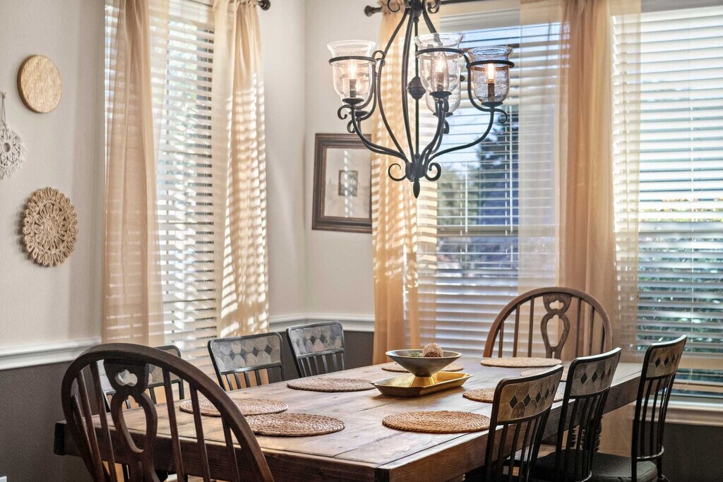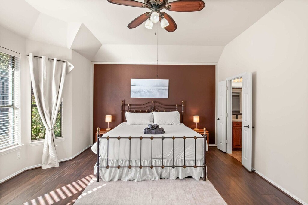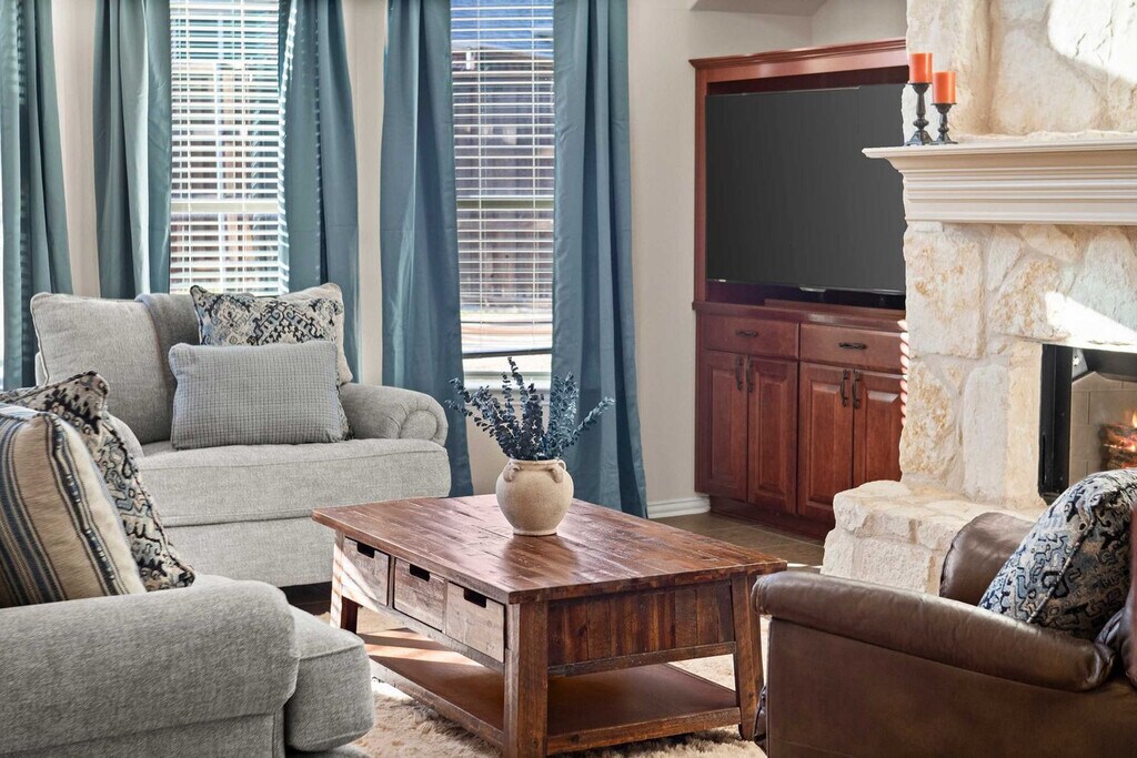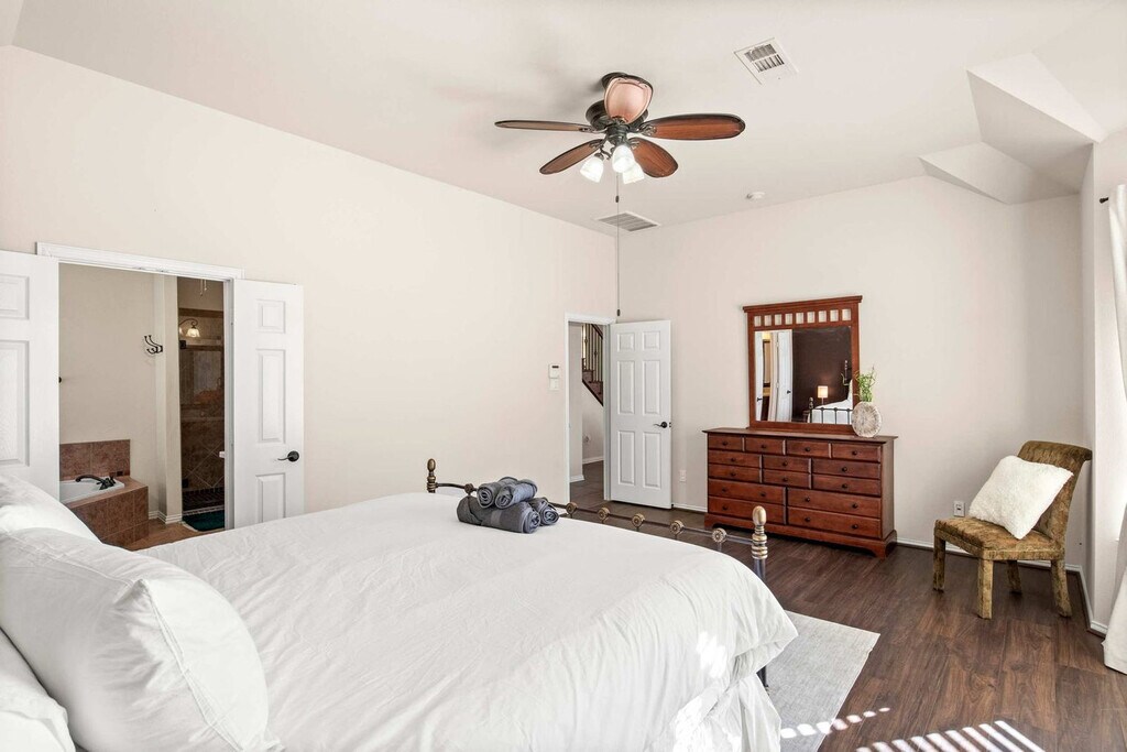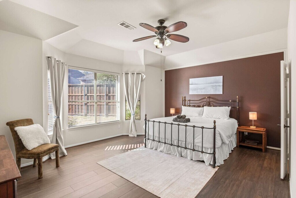 Feel at home in this spacious retreat located just minutes from Lake Lewisville. With 4 bedrooms and 3 bathrooms, this home offers over 3,200 square feet of comfortable living space. This home features a fully equipped kitchen with stainless-steel appliances, including ovens, a fridge, a freezer, a stove, a microwave, and a dishwasher, as well as cooking essentials. The dining area includes a cozy breakfast nook and a formal dining area with place settings and cutlery. The living area offers a couch and sofas, a coffee table, a designer rug, a flat-screen TV, and high-speed Wi-Fi. A laundry room with a washer and dryer is available for your use. You will also have access to a private, fully fenced backyard. House-trained pets are welcome with a non-refundable pet fee of $150 per pet, with a maximum of 2 pets per stay. An additional nightly rate of $29 will be applied for each guest exceeding six. Nestled along the shores of Lake Lewisville, Hickory Creek offers a peaceful lakeside escape with the convenience of nearby city life. Lewisville Lake Park, Wayne Ferguson Plaza, and Lewisville Grand Theater are all within a short drive. Dallas attractions such as the ICR Discovery Center for Science & Earth History and the Mandalay Canal Walk at Las Colinas are also easily accessible. Smoking of any type is not allowed, and violations are subject to a $450 fine plus the cost to clean, deodorize, and repair damages. Only registered guests are allowed on the property. The fireplace should only be used if you are familiar with how to use it properly and should not be left unattended. No street parking is allowed due to City Parking Regulations. The maximum number of cars allowed are 3 in the garage and 3 in the driveway. [SI]