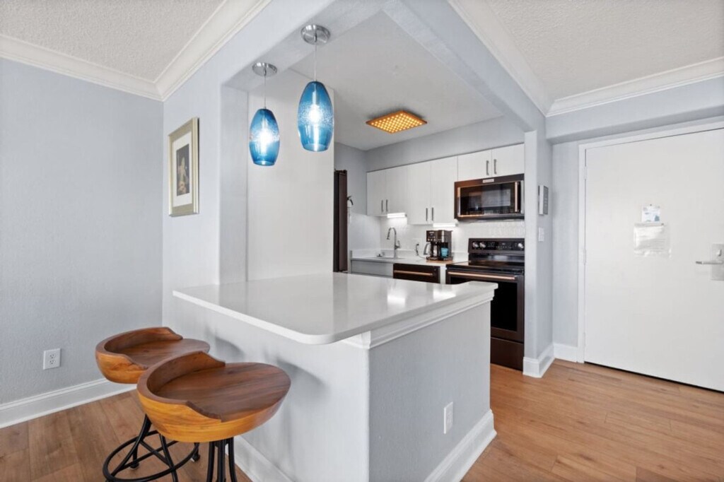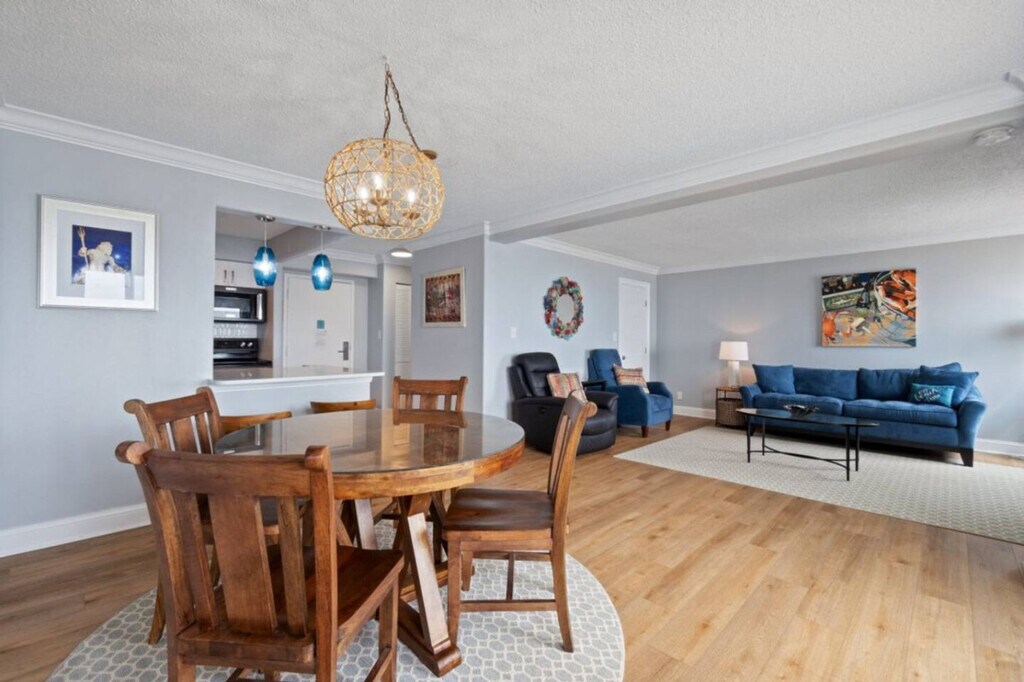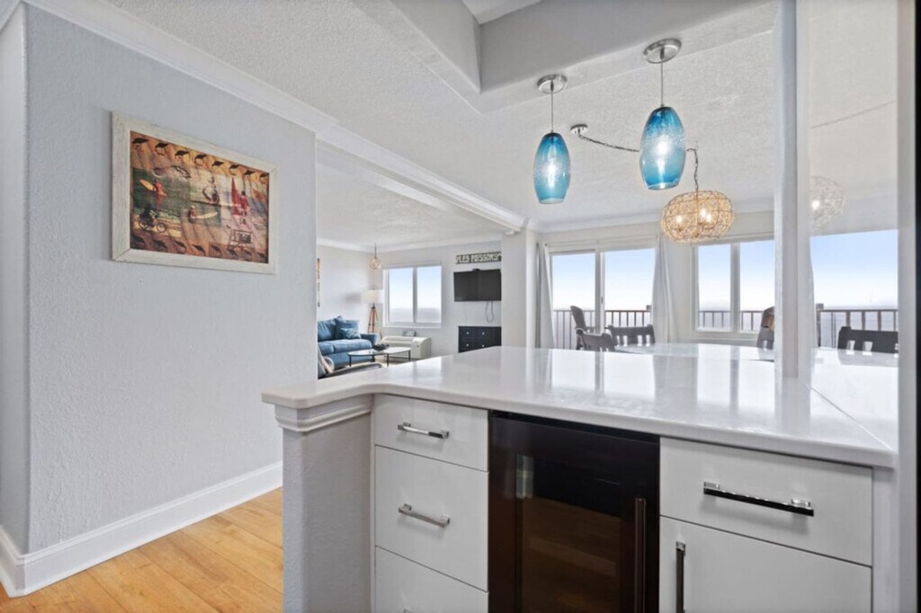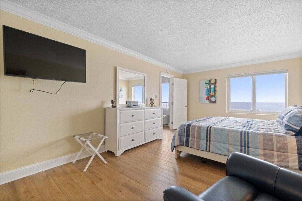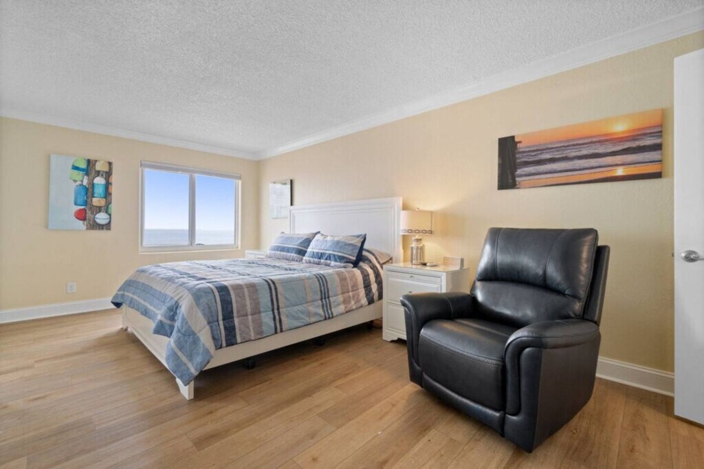 Experience the best of Virginia Beach in this stunning 1-bedroom oceanfront condo on the 11th floor, completely renovated in spring 2023. Wake up each morning to incredible ocean views from every room, where the Atlantic Ocean stretches endlessly before you from this high-floor location. Feel at home in this beautifully updated private residence. This apartment features brand new flooring throughout and new AC systems for your comfort. The space is tastefully decorated with artwork from local and regional artists, giving it a true coastal feel. The updated kitchen shines with custom white cabinets, elegant quartz countertops, and stainless steel appliances. From the kitchen, you can see straight through to the spacious dining room and living area, all with amazing Virginia Beach oceanfront views as your backdrop. One dedicated parking spot is included. Positioned on the 11th floor of the desirable Dolphin Run complex, you'll enjoy some of the most amazing oceanfront views available while being perfectly located to experience everything Virginia Beach has to offer. Many events are held on the public beach in front of Dolphin Run. The minimum age to book is 25 years old, and the primary booking guest must be 25 years old and staying on the property. Guests not on the reservation will not be allowed in the secured building. Parties or disruptive behaviors will be addressed by security. [SI]