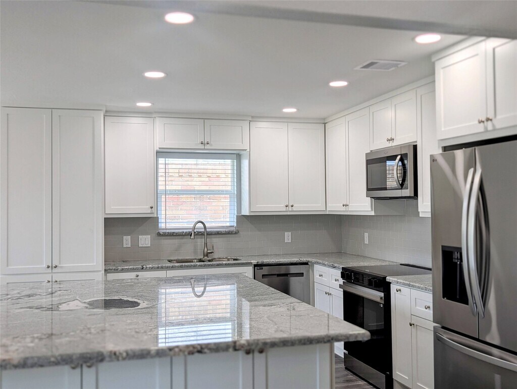 Recently renovated 3-bedroom,2-bath home featuring modern finishes and an open layout. The kitchen features a large granite island with storage,stainless steel appliances,and a seamless connection to the living room. Recessed lighting and durable vinyl plank flooring are also featured throughout the home. The primary suite includes a walk-in closet with built-in shelving and an en-suite bathroom with a walk-in shower. Additional built-in storage is located between the secondary bedrooms,which share a full bathroom with a walk-in shower. A spacious fenced backyard provides the perfect space for outdoor living. The attached 2-car garage features epoxy flooring and built-in storage cabinets. Washer,dryer,and refrigerator are included. Move-in ready,this home combines stylish updates with thoughtful design,making it an excellent opportunity. No Smoking and No Pets. MLS# 96884406